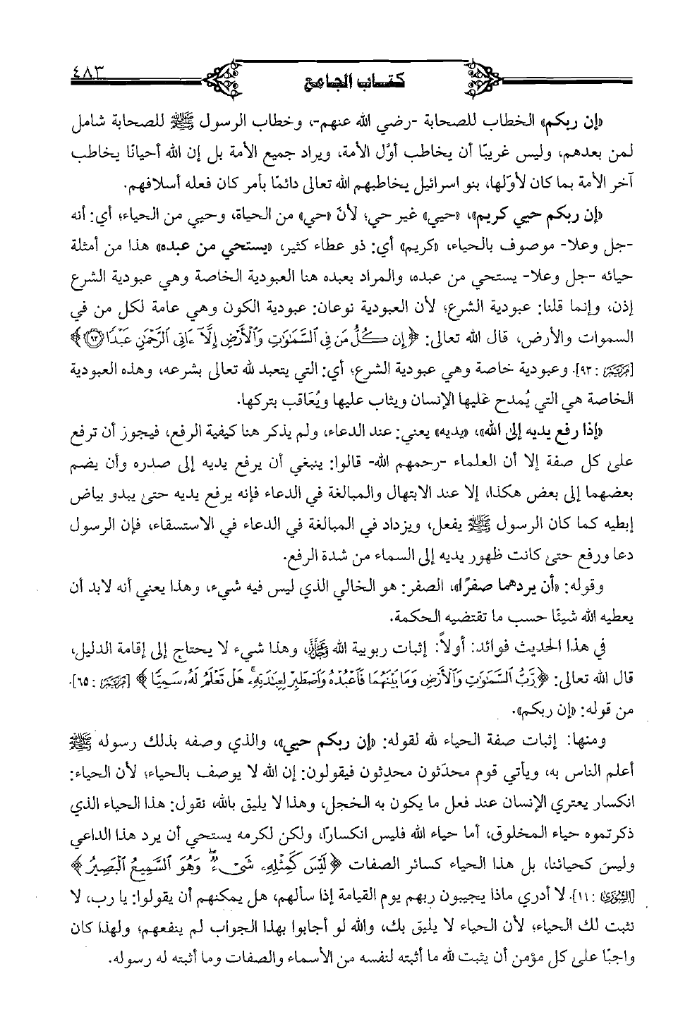 "إن ربكم حيي كريم" "حيي" غير حي؛ لأن "حي" من الحياة، وحيي من الحياء؛ أي: أنه -جل وعلا- موصوف بالحياء، "كريم" أي: ذو عطاء كثير، "يستحي من عبده" هذا من أمثلة حيائه -جل وعلا- يستحي من عبده، والمراد بعبده هنا العبودية الخاصة وهي عبودية الشرع إذن، وإنما قلنا: عبودية الشرع؛ لأن العبودية نوعان: عبودية الكون وهي عامة لكل من في السموات والأرض، قال الله تعالى: {إن كل من في السموات والأرض إلا ءاتى الرحمن عبداً} [مريم: 93]. وعبودية خاصة وهي عبودية الشرع؛ أي: التي يتعبد لله تعالى بشرعه، وهذه العبودية الخاصة هي التي يمدح عليها الإنسان ويثاب عليها ويعاقب بتركها.