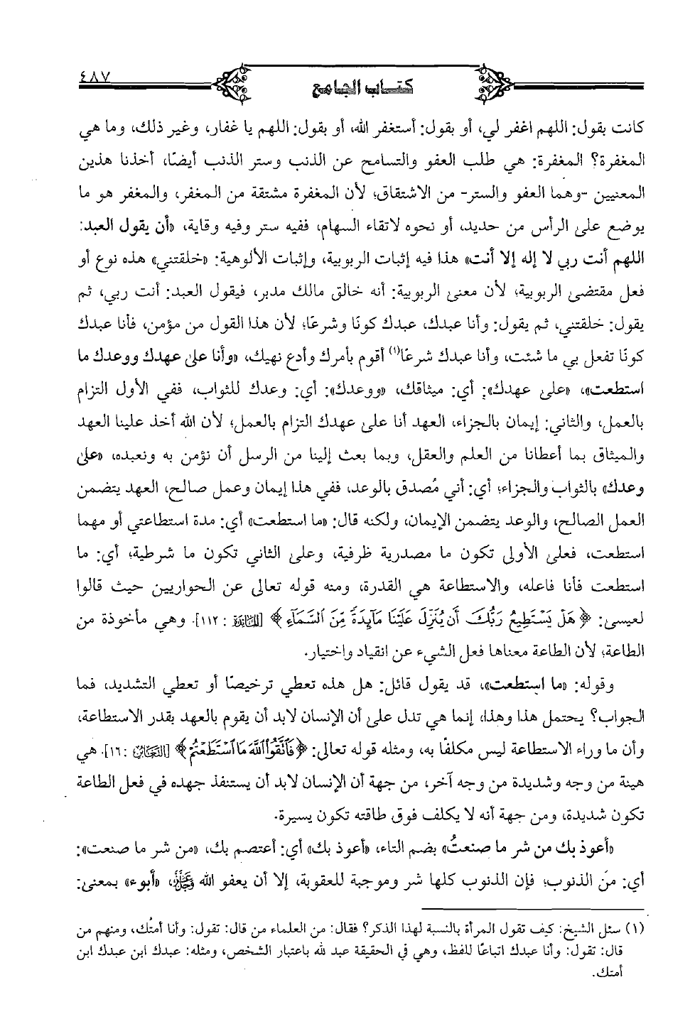 كانت بقول: اللهم اغفر لي، أو بقول: أستغفر الله، أو بقول: اللهم يا غفار، وغير ذلك، وما هي المغفرة؟ المغفرة: هي طلب العفو والتسامح عن الذنب وستر الذنب أيضاً، أخذنا هذين المعنيين -وهما العفو والستر- من الاشتقاق؛ لأن المغفرة مشتقة من المغفر، والمغفر هو ما يوضع على الرأس من حديد، أو نحوه لاتقاء السهام، ففيه ستر وفيه وقاية، "أن يقول العبد: اللهم أنت ربي لا إله إلا أنت" هذا فيه إثبات الربوبية، وإثبات الألوهية: "خلقتني" هذه نوع أو فعل مقتضى الربوبية؛ لأن معنى الربوبية: أنه خالق مالك مدبر، فيقول العبد: أنت ربي، ثم يقول: خلقتني، ثم يقول: وأنا عبدك، عبدك كوناً وشرعاً؛ لأن هذا القول من مؤمن، فأنا عبدك كوناً تفعل بي ما شئت، وأنا عبدك شرعاً أقوم بأمرك وأدع نهيك، "وأنا على عهدك ووعدك ما استطعت"، "على عهدك": أي: ميثاقك، "ووعدك": أي: وعدك للثواب، ففي الأول التزام بالعمل، والثاني: إيمان بالجزاء، العهد أنا على عهدك التزام بالعمل؛ لأن الله أخذ علينا العهد والميثاق بما أعطانا من العلم والعقل، وبما بعث إلينا من الرسل أن نؤمن به ونعبده، "على وعدك" بالثواب والجزاء؛ أي: أني مصدق بالوعد، ففي هذا إيمان وعمل صالح، العهد يتضمن العمل الصالح، والوعد يتضمن الإيمان، ولكنه قال: "ما استطعت" أي: مدة استطاعتي أو مهما استطعت، فعلى الأولى تكون ما مصدرية ظرفية، وعلى الثاني تكون ما شرطية؛ أي: ما استطعت فأنا فاعله، والاستطاعة هي القدرة، ومنه قوله تعالى عن الحواريين حيث قالوا لعيسى: {هل يستطيع ربك أن ينزل علينا مآئدةً من السماء} [المائد: 112]. وهي مأخوذة من الطاعة؛ لأن الطاعة معناها فعل الشيء عن انقياد واختيار.