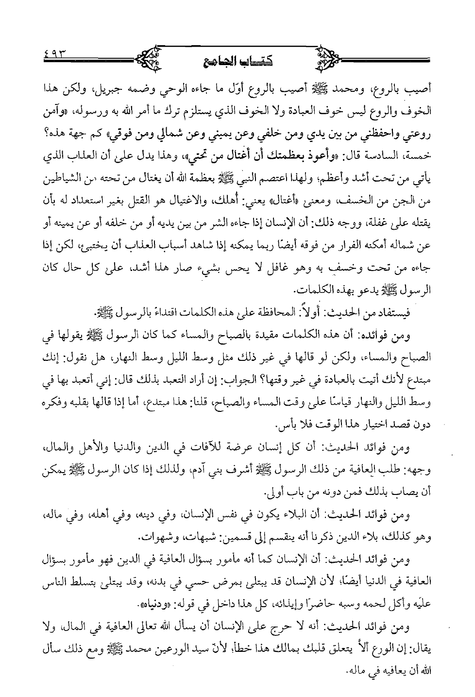 ومن فوائده: أن هذه الكلمات مقيدة بالصباح والمساء كما كان الرسول صلى الله عليه وسلم يقولها في الصباح والمساء، ولكن لو قالها في غير ذلك مثل وسط الليل وسط النهار، هل نقول إنك مبتدع لأنك أتيت بالعبادة في غير وقتها؟ الجواب إن أراد التعبد بذلك قال: إني أتعبد بها في وسط الليل والنهار قياسا على وقت المساء والصباح، قلنا: هذا مبتدع، أما إذا قالها بقلبه وفكره دون قصد اختيار هذا الوقت فلا بأس.