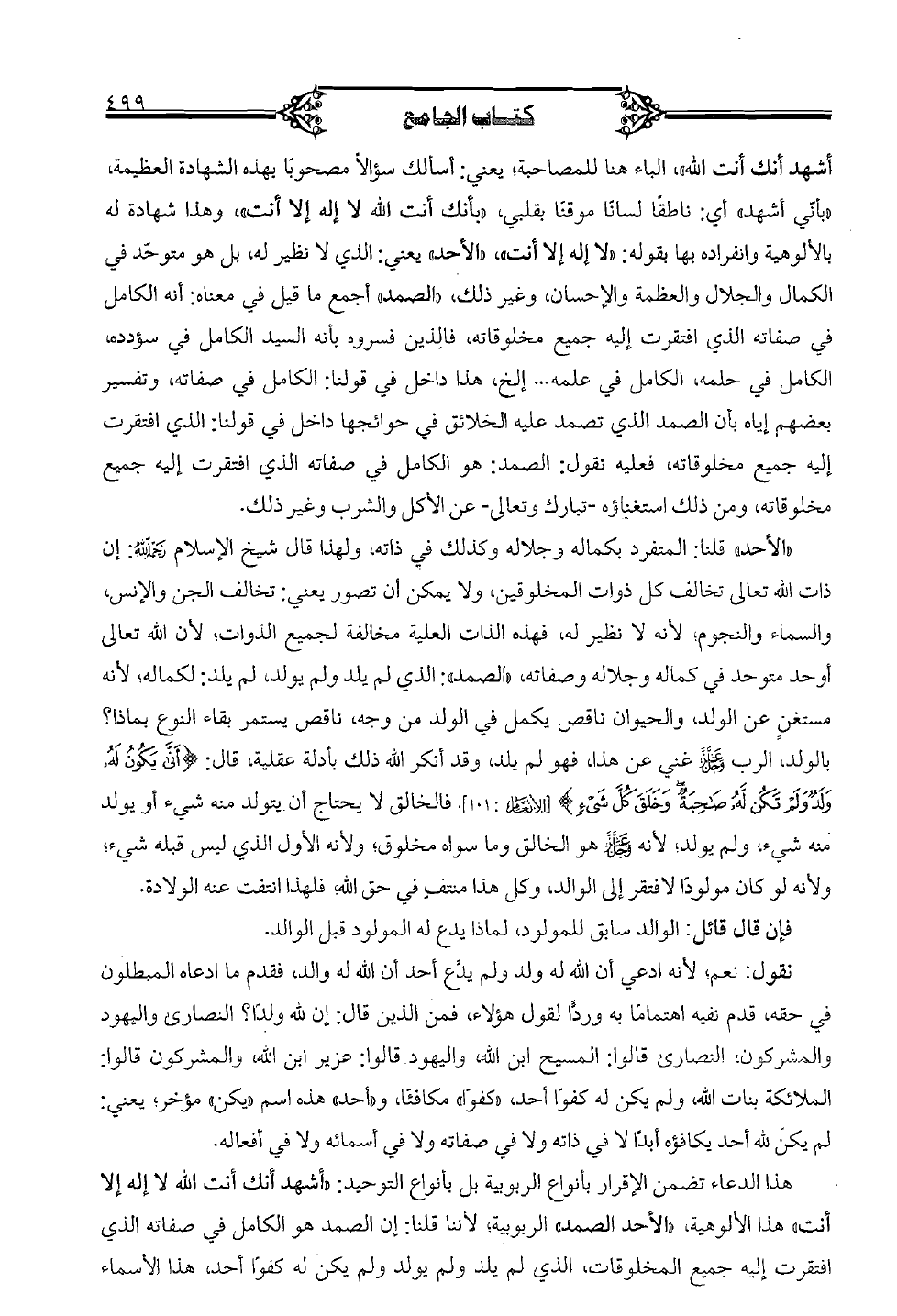 أشهد أنك أنت الله"، الباء هنا للمصاحبة؛ يعني: أسألك سؤالا مصحوبا بهذه الشهادة العظيمة، "بأني أشهد" أي: ناطقا لسانا موقنا بقلبي، "بأنك أنت الله لا إله إلا أنت"، وهذا شهادة له بالألوهية وانفراده بها بقول: "لا إله إلا أنت"، "الأحد" يعني: الذي لا نظير له، بل هو متوحد في الكمال والجمال والعظمة والإحسان، وغير ذلك، "الصمد" أجمع ما قيل في معناه: أنه الكامل في صفاته الذي افتقرت إليه جميع مخلوقاته، فالذين فسروه بأنه السيد الكامل في سؤدده، الكامل في حلمه، الكامل في علمه ... إلخ، هذا داخل في قولنا: الكامل في صفاته، وتفسير بعضهم إياه بأن الصمد عليه الخلائق في حوائجها داخل في قولنا: الذي افتقرت إليه جميع مخلوقاته، فعليه نقول: الصمد هو الكامل في صفاته الذي افتقرت إليه جميع مخلوقاته، ومن ذلك استغناؤه - تبارك وتعالى - عن الأكل والشرب وغير ذلك.