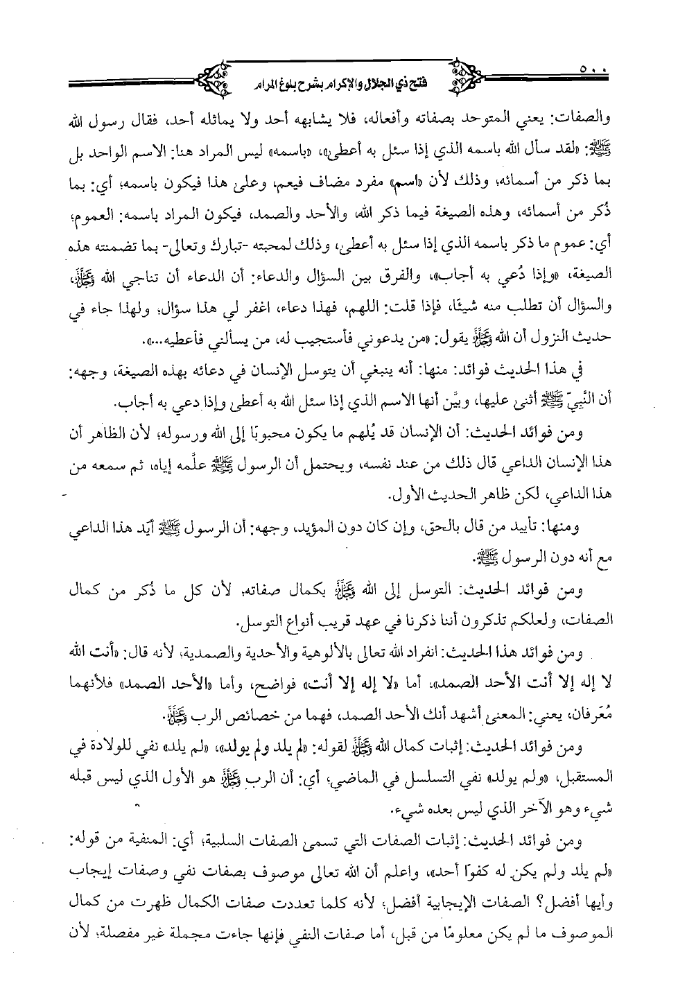 والصفات: يعني المتوحد بصفاته وأفعاله، فلا يشابهه أحد ولا يماثله أحد، فقال رسول الله صلي الله عليه وسلم: "لقد سأل الله باسمه الذي إذا سئل به أعطى"، "باسمه" ليس المراد هنا: الاسم الواحد بل بما ذكر من أسمائه؛ وذلك لأن "اسم" مفرد مضاف فيعم، وعلى هذا فيكون باسمه؛ أي: بما ذكر من أسمائه، وهذه الصيغة فيما ذكر الله والأحد والصمد، فيكون المراد باسمه: العموم؛ أي: عموم ما ذكر باسمه الذي سئل به أعطي، وذلك لمحبته -تبارك وتعالى- بما تضمنته هذه الصيغة، "وإذا دعي به أجاب"، والفرق بين السؤال والدعاء: أن الدعاء أن تناجي الله عز وجل، والسؤال أن تطلب منه شيئا، فإذا قلت: اللهم، فهذا دعاء، أغفر لي هذا سؤال؛ ولهذا جاء في حديث النزول أن الله عز وجل يقول: "من يدعوني فأستجيب له، من يسألني فأعطيه ... ".