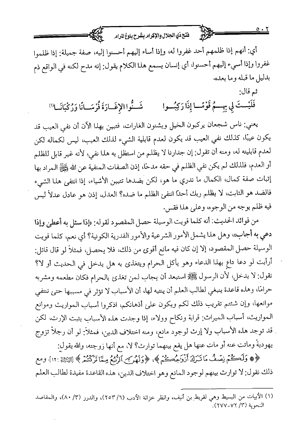 يعني: ناس شجعان يركبون الخيل ويشنون الغارات، فتبين بهذا الآن أن نفي العيب قد يكون عيبًا، كذلك نفي العيب قد يكون لعدم قابلية الشيء لذلك العيب، ليس لكماله لكن لعدم قابليته له، ومنه أن تقول: إن جدارنا لا يظلم من استظل به هذا نفي؛ لأنه غير قابل للظلم أو العدم، فلذلك لم يكن نفي الظلم في حقه مدحًا، إذن الصفات المنفية عن الله عز وجل المراد بها إثبات صفة كمال، الكمال ما ندري ما هو، لكن بضدها تتبين الأشياء، إذا انتفى هذا الشيء فالضد هو الثابت، لا يظلم ربك أحدًا انتفى الظلم ما ضده؟ العدل، إذن هو عادل عدلاً ليس فيه ظلم بوجه من الوجوه، وعلى هذا فقس.