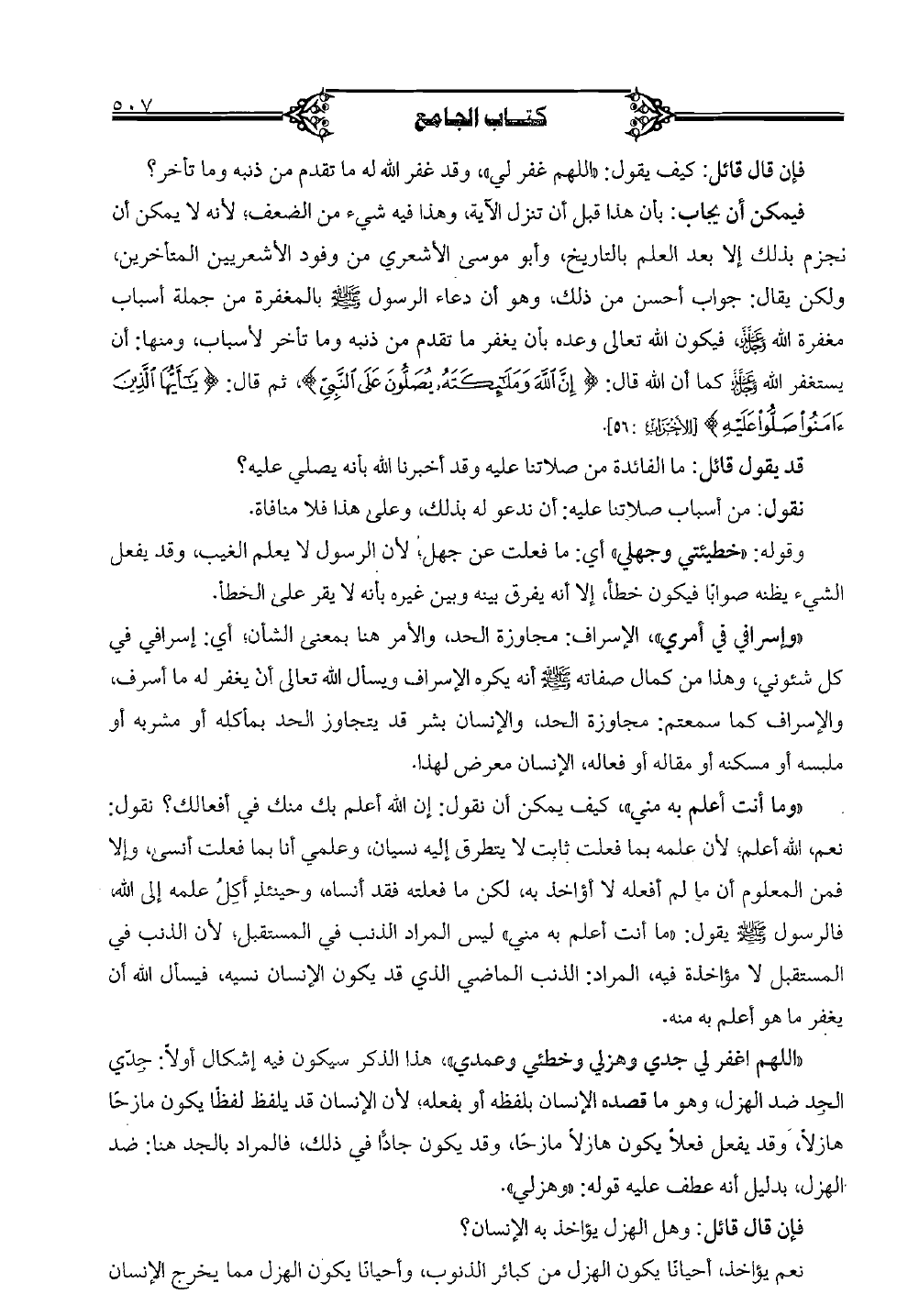 "اللهم اغفر لي جدي وهزلي وخطئي وعمدي"، هذا الذكر سيكون فيه إشكال أولاً: جدّي الجد ضد الهزل، وهو ما قصده الإنسان بلفظه أو بفعله؛ لأن الإنسان قد يلفظ لفظًا يكون مازحًا هازلاً، وقد يفعل فعلاً يكون هازلاً مازحًا، وقد يكون جادًا في ذلك، فالمراد بالجد هنا: ضد الهزل، بدليل أنه عطف عليه قوله: "وهزلي".