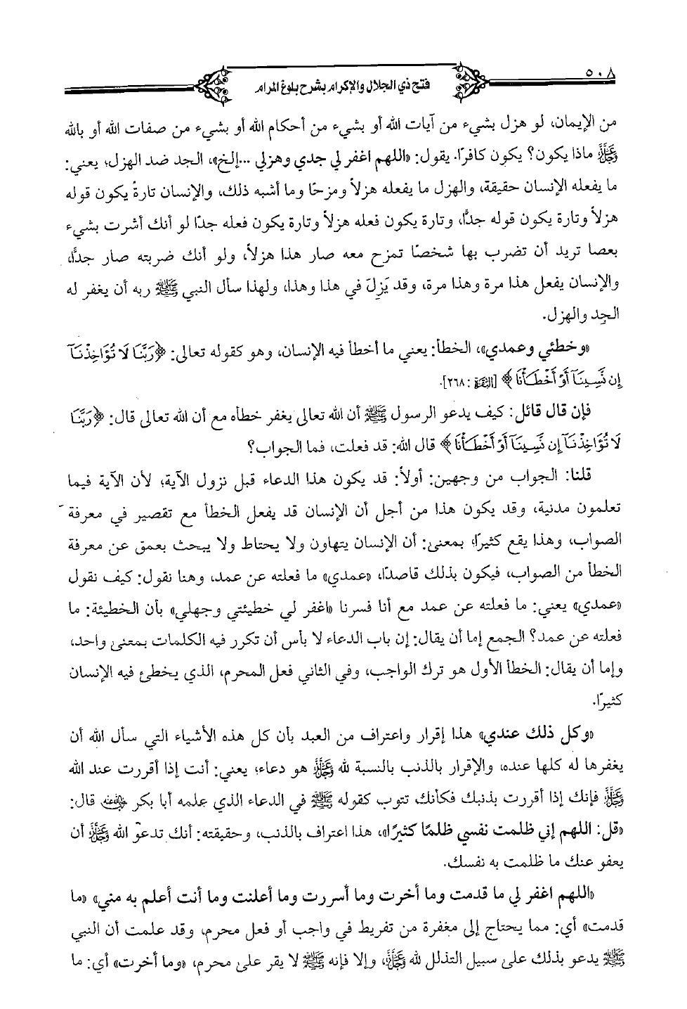 من الإيمان، لو هزل بشيء من آيات الله أو بشيء من أحكام الله أو بشيء من صفات الله أو بالله عز وجل ماذا يكون؟ يكون كافرًا. يقول: "اللهم اغفر لي جدي وهزلي ... الخ"، الجد ضد الهزل، يعني: ما يفعله الإنسان حقيقة، والهزل ما يفعله هزلاً ومزحًا وما أشبه ذلك، والإنسان تارة يكون قوله هزلاً وتارة يكون قوله جدًا، وتارة يكون فعله هزلاً وتارة يكون فعله جدًا لو أنك أشرت بشيء بعصا تريد أن تضرب بها شخصًا تمزح معه صار هذا هذلاً، ولو أنك ضربته صار جدًا، والإنسان يفعل هذا مرة وهذا مرة، وقد يزلّ في هذا وهذا، ولهذا سأل النبي صلى الله عليه وسلم ربه أن يغفر له الجد والهزل.