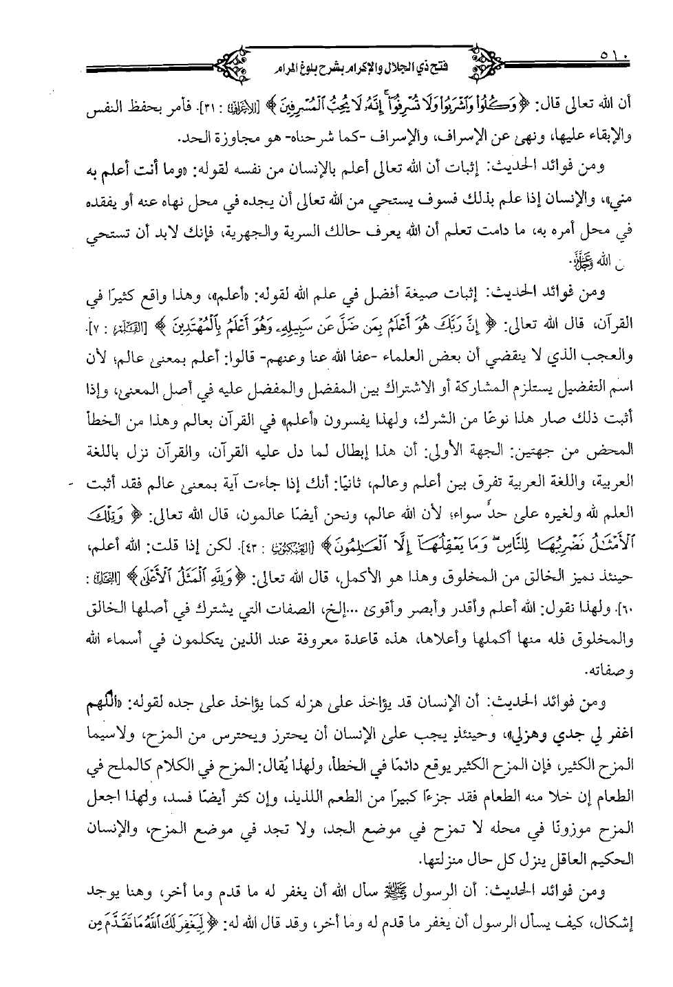ومن فوائد الحديث: إثبات صيغة أفضل في علم الله لقوله: "أعلم"، وهذا واقع كثيرًا في القرآن، قال الله تعالى: {إن ربك هو أعلم بمن ضلَّ عن سبيله وهو أعلم بالمهتدين} [القلم: 7]. والعجب الذي لا ينقضي أن بعض العلماء- عفا الله عنا وعنهم- قالوا: أعلم بمعنى عالم؛ لأن اسم التفضيل يستلزم المشاركة أو الاشتراك بين المفضل والمفضل عليه في أصل المعنى، وإذا أثبت ذلك صار هذا نوعًا من الشرك، ولهذا يفسرون "أعلم" في القرآن بعالم وهذا من الخطأ المحض من جهتين: الجهة الأولى: أن هذا إبطال لما دل عليه القرآن، والقرآن نزل باللغة العربية، واللغة العربية تفرق بين أعلم وعالم، ثانيًا: أنك إذا جاءت آية بمعنى عالم فقد أثبت العلم لله ولغيره على حد سواء؛ لأن الله عالم، ونحن أيضًا عالمون، قال الله تعالى: {وتلك الأمثال نضربها للنَّاس وما يعقلها إلاَّ العالمون} [العنكبوت: 43]. لكن إذا قلت: الله أعلم، حينئذ نميز الخالق من المخلوق وهذا هو الأكمل، قال الله تعالى: {ولله المثل الأعلى} [النحل: 60]. ولهذا نقول: الله أعلم وأقدر وأبصر وأقوى ... الخ، الصفات التي يشترك في أصلها الخالق والمخلوق فله منها أكملها وأعلاها، هذه قاعدة معروفة عند الذين يتكلمون في أسماء الله وصفاته.