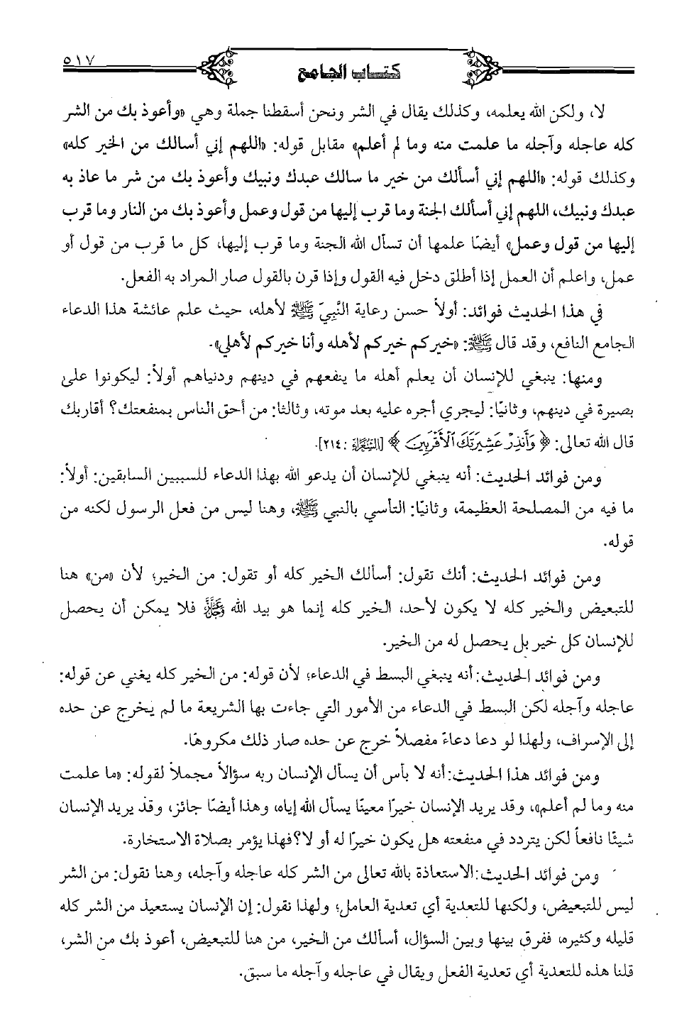 ومن فوائد الحديث: أنه لا بأس أن يسأل الإنسان ربه سؤالاً مجملاً لقوله: "ما علمت منه وما لم أعلم", وقد يريد الإنسان خيراً معيناً يسأل الله إياه, وهذا أيضًا جائز, وقد يريد الإنسان شيئاً نافعاً لكن يتردد في منفعته هل يكون خيراً له أو لا؟ فهذا يؤمر بصلاة الاستخارة.