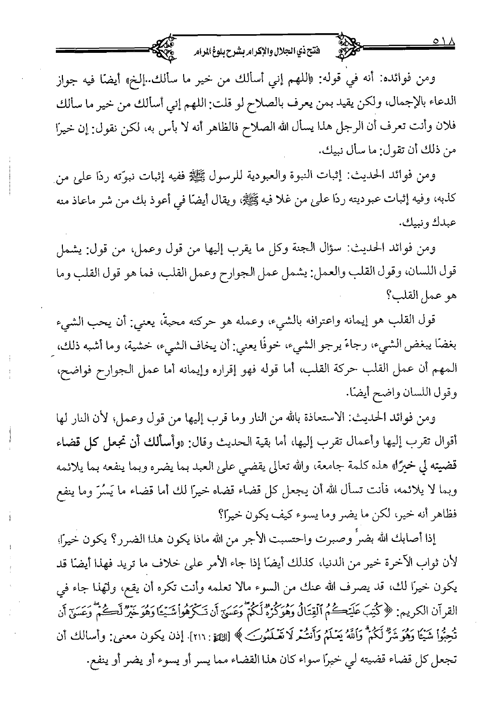 إذا أصابك الله بضر وصبرت واحتسبت الأجر من الله ماذا يكون هذا الضرر؟ يكون خيراً؛ لأن ثواب الآخرة خير من الدنيا, كذلك أيضًا إذا جاء الأمر على خلاف ما تريد فهذا أيضًا قد يكون خيراً لك, قد يصرف الله عنك من السوء ما لا تعلمه وأنت تكره أن يقع, ولهذا جاء في القرآن الكريم: {كنت الله عليكم القتال وهو كره لكم وعسى أن تكرهوا شيئاً وهو خير لكم وعسى أن تحبوا شيئاً وهو شر لكم والله يعلم وأنت لا تعلمون} [البقرة: 216]. إذن يكون معنى: وأسألك أن تجعل كل قضاء قضيته لي خيراً سواء كان هذا القضاء مما يسر أو يسوء أو يضر أو ينفع.