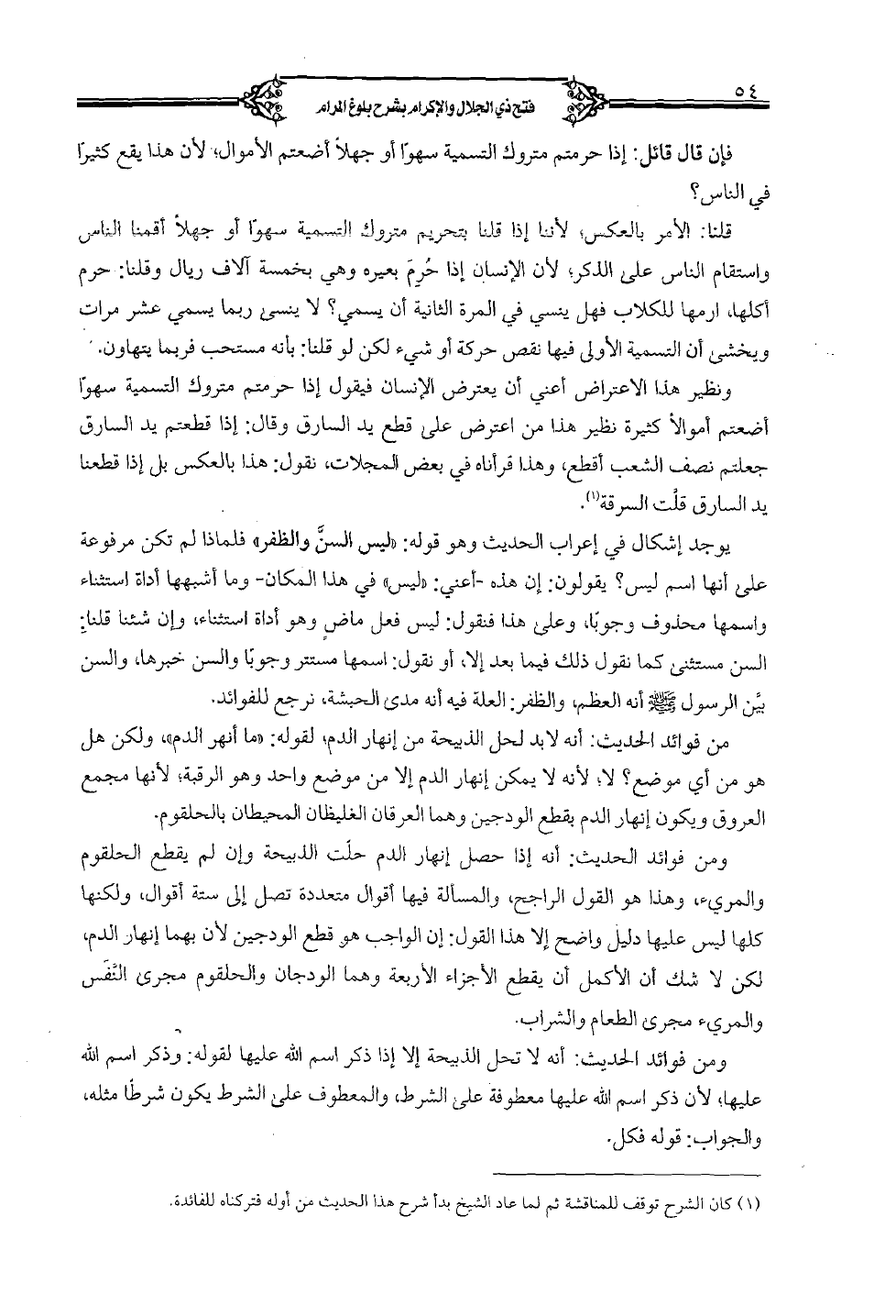 يوجد إشكال في إعراب الحديث وهو قوله: «ليس السن والظفر» فلماذا لم تكن مرفوعة على أنها اسم ليس؟ يقولون: إن هذه- أعني «ليس» في المكان- وما أشبهها أداة استثناء واسمها محذوف وجوباً، وعلى هذا فنقول: ليس فعل ماض وهو أداة استثناء، وإن شئنا قلنا: السن مستثنى كما نقول ذلك فيما بعد إلا، أو نقول: اسمها مستتر وجوباً والسن خبرها، والسن بين الرسول صلى الله عليه وسلم أنه العظم، والظفر: العلة فيه أنه مدى الحبشة، نرجع للفوائد.