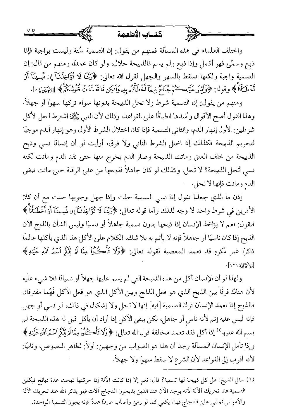 ولهذا لو أن الإنسان أكل من هذه الذبيحة التي لم يسم عليها جهلاً أو نسياناً فلا شيء عليه لأن هناك فرقاً بين الذبح الذي هو فعل الذابح وبين الأكل الذي هو فعل الآكل فهما مفترقان فالذبح إذا تعمد الإنسان ترك التسمية [فيه] إنها لا تحل ولا إشكال في ذلك، لو نسي أو جهل فإنه ليس عليه إثم لأنه ناس أو جاهل، لكن يبقى الآكل إذا أراد أن يأكل قيل له هذه الذبيحة لم يسم الله عليها إذا أكل فقد تعمد مخالفة قول الله تعالى: {ولا تأكلوا مما لم يذكر اسم الله عليه} وإذا تأمل الإنسان المسألة وجد أن هذا هو الصواب من وجهين: أولاً: لظاهر النصوص، وثانياً لأنه أقرب إلى القواعد لأن الشرع لا سقط سهواً ولا جهلاً.
