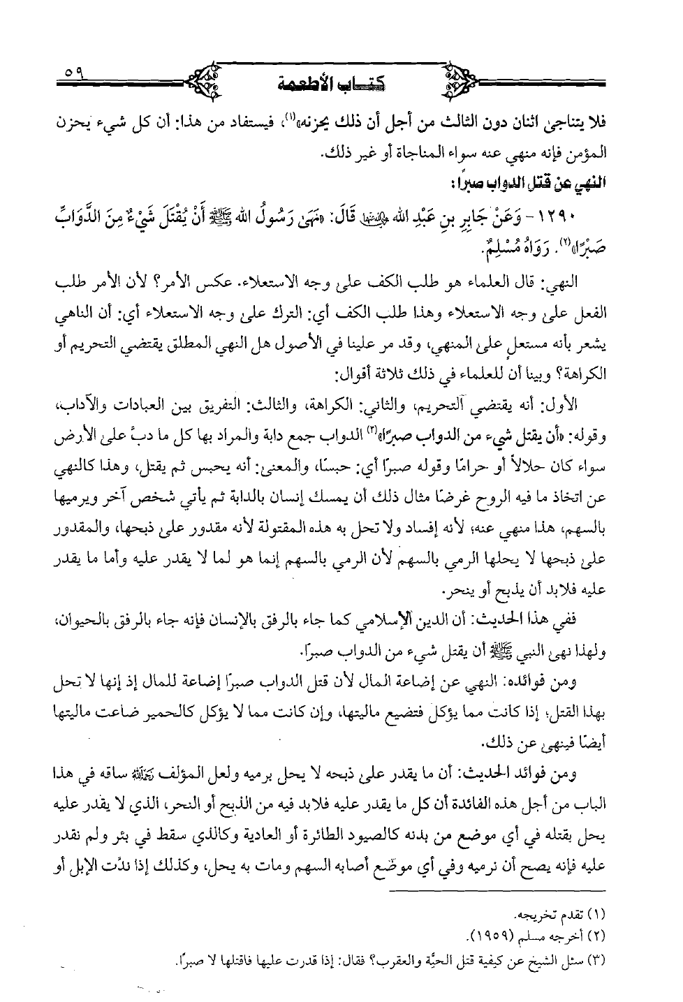 الأول: أنه يقتضي التحريم، والثاني: الكراهة، والثالث: التفريق بين العبادات والآداب، وقوله: «أن يقتل شيء من الدواب صبراً» الدواب جمع دابة والمراد بها كل ما دب علي الأرض سواء كان حلالاً أو حراماً وقوله صبراً أي: حبساً، والمعنى: أنه يحبس ثم يقتل، وهذا كالنهي عن اتخاذ ما فيه الروح غرضاً مثال ذلك أن يمسك إنسان بالدابة ثم يأتي شخص آخر ويرميها بالسهم/ هذا منهي عنه؛ لأنه إفساد ولا تحل به هذه المقتولة لأنه مقدور على ذبحها، والمقدور على ذبحها لا يحلها الرمي بالسهم لأن الرمي بالسهم إنما هو لما لا يقدر عليه وأما ما يقدر عليه فلابد أن يذبح أو ينحر.