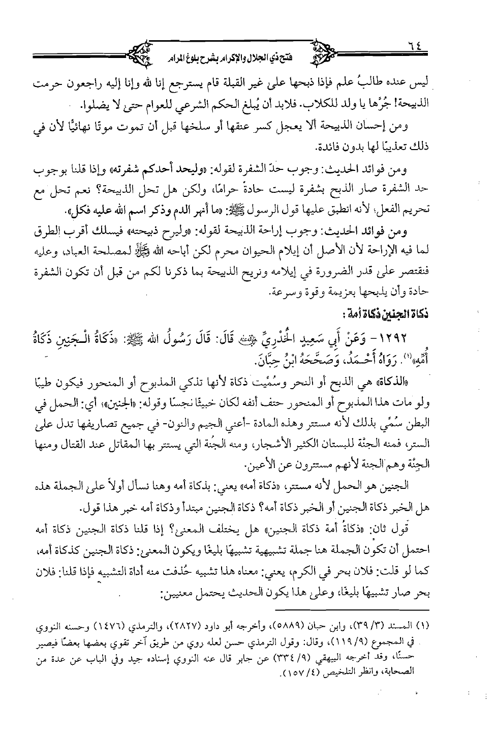 1292 - وعن أبي سعيد الخدري رضي الله عنه قال: قال رسول الله صلى الله عليه وسلم: «ذكاة الجنين ذكاة أمه» رواه أحمد، وصححه ابن حبان.