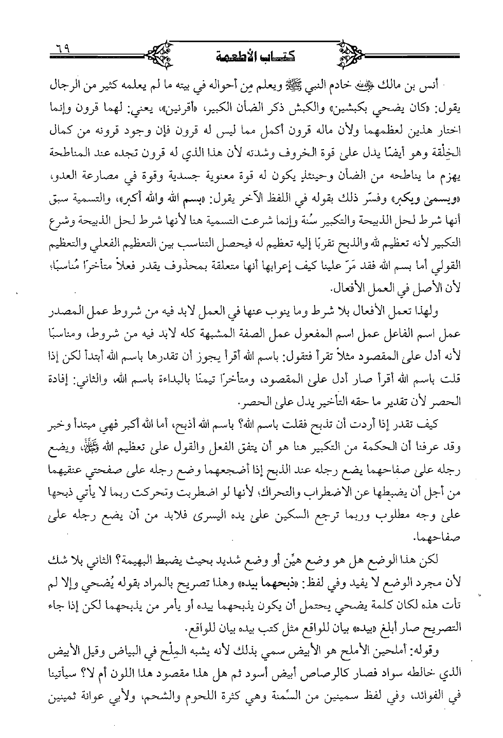 أنس بن مالك رضي الله عنه خادم النبي صلى الله عليه وسلم ويعلم من أحواله في بيته ما لم يعلمه كثير من الرجال يقول: «كان يضحي بكبشين» والكبش ذكر الضأن الكبير، «أقرنين» يعني: لهما قرون وإنما اختار هذين لعظمهما ولأن ماله قرون أكمل مما ليس له قرون فإن وجود قرونه من كمال الخلقة وهو أيضاً يدل على قوة الخروف وشدته لأن هذا الذي له قرون تجده عند المناطحة يهزم ما يناطحه من الضأن وحينئذ يكون له قوة معنوية جسدية وقوة في مصارعة العدة، «ويسمى ويكبر» وفسر ذلك بقوله في اللفظ الآخر يقول: «بسم الله والله أكبر» والتسمية سبق أنها شرط لحل الذبيحة والتكبير سنة وإنما شرعت التسمية هنا لأنها شرط لحل الذبيحة وشرع التكبير لأنه تعظيم لله والذبح تقربا إليه تعظيم له فيحصل التناسب بين التعظيم الفعلي والتعظيم القولي أما بسم الله فقد مر علينا كيف إعرابها أنها متعلقة بمحذوف يقذر فعلا متأخراً مناسباً، لأن الأصل في العمل الأفعال.