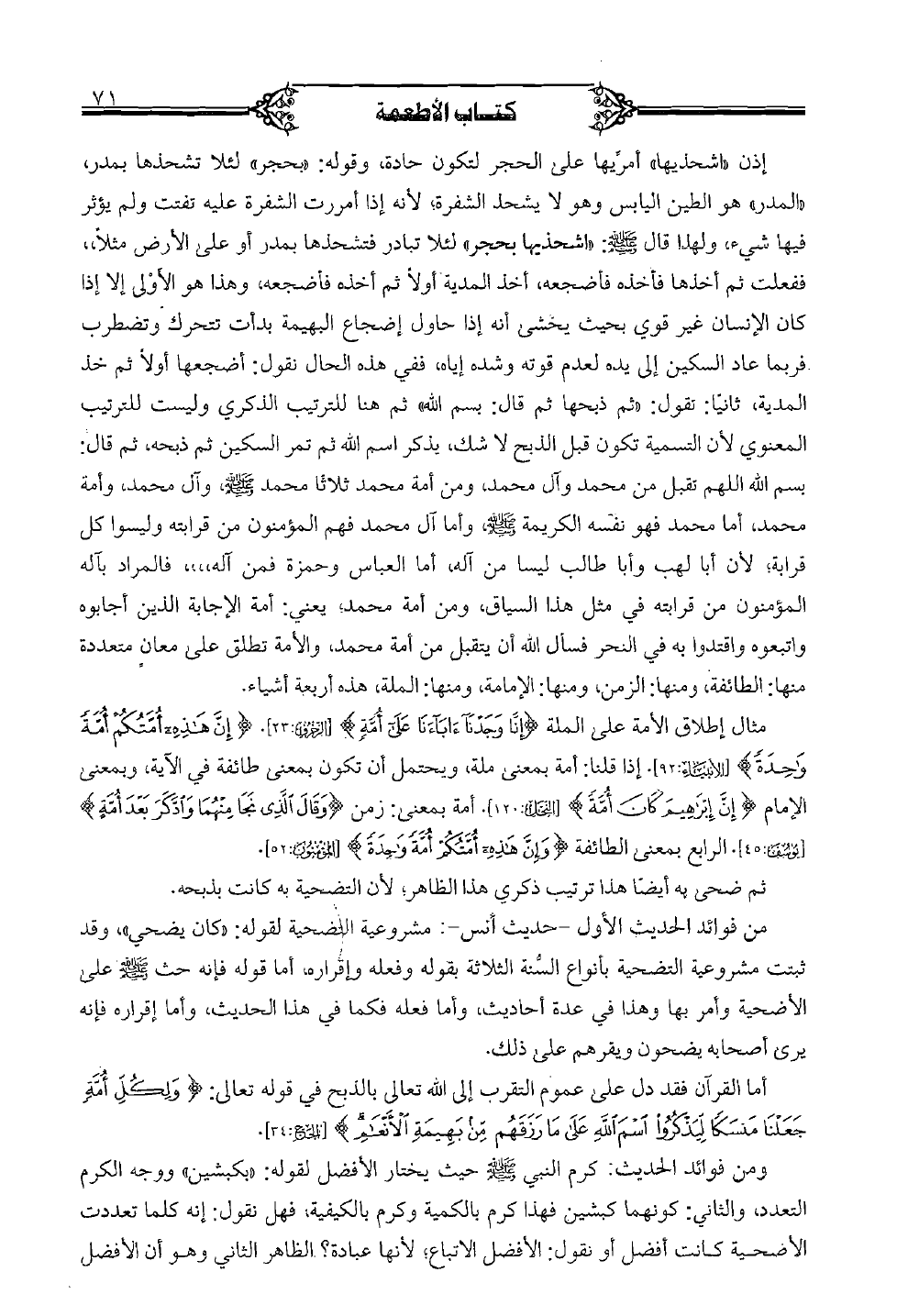 إذن «اشحذيها» أمريها على الحجر لتكون حادة، وقوله: «بحجر» لئلا تشحذها بمدر، «المدر» هو الطين اليابس هو لا يشحذ الشفرة؛ لأنه إذا أمررت الشفرة عليه تفتت ولم يؤثر فيها شيء، ولهذا قال صلى الله عليه وسلم: «اشحذيها بحجر» لئلا تبادر فتشحذها بمدر أو على الأرض مثلاً، ففعلت ثم أخذها فأخذه فأضجعه، أخذ المدية أولاً ثم أخذه فأضجعه، وهذا هو الأولى إلا إذا كان الإنسان غير قوي بحيث يخشى أنه إذا حاول إضجاع البهيمة بدأت تتحرك وتضطرب فربنا عاد السكين إلى يده لعلم قوته وشده إياه، ففي هذه الحال نقول: أضجعها أولاً ثم خذ المدية، ثانياً: تقول: «ثم ذبحها ثم قال: بسم الله» ثم هنا للترتيب الذكري وليست للترتيب المعنوي لأن التسمية تكون قبل الذبح لا شك، يذكر اسم الله ثم تمر السكين ثم ذبحه، ثم قال: بسم الله اللهم تقبل من محمد وآل محمد، ومن أمة محمد ثلاثاً محمد صلى الله عليه وسلم وآل محمد، وأمة محمد، أما محمد فهو نفسه الكريمة صلى الله عليه وسلم وأما آل محمد فهم المؤمنون من قرابته وليسوا كل قرابة؛ لأن أبا لهب وأبا طالب ليسا من آله، أما العباس وحمزة فمن آله، ، ، ، فالمراد بآله المؤمنون من قرابته في مثل هذا السياق، ومن أمة محمد، يعني: أمة الإجابة الذين أجابوه واتبعوه واقتدوا به في النحر فسأل الله أن يتقبل من أمة محمد، والأمة تطلق على معان متعددة منها: الطائفة، ومنها: الزمن، ومنها: الإمامة، ومنها: الملة، هذه أربعة أشياء.
