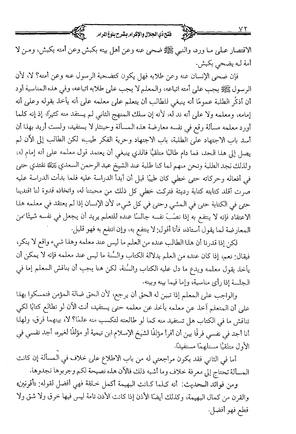 فإن ضحى الإنسان عنه عن طلابه فهل يكون كتضحية الرسول عنه وعن أمته؟ لا؛ لأن الرسول صلى الله عليه وسلم يجب على أمته اتباعه، والمعلم لا يجب على طلابه أتباعه، وفي هذه المناسبة أود أن أذكر الطلبة عموماً أنه ينبغي للطالب أن يتعلم على معلمه على أنه يأخذ بقوله وعلى أنه إمامه، ومعلمه ولا على انه ند له، لأنه إن سلك المنهج الثاني لم يستفيد منه كثيراً؛ إذ إنه كلما أورد معلمه مسألة وقع في نفسه معارضة هذه المسألة وحينئذ لا يستفيد، ولست أريد بهذا أن أسد باب الاجتهاد على الطلبة، باب الاجتهاد وحرية الفكر طيب، ولكن الطالب إلى الآن لم يصل إلى هذا الحد، فما دام طالباً متلقياً فالذي ينبغي أن يعتمد قول معلمه على أنه إمام له، ولذلك نجد الطلبة ونحن منهم لما كنا طلبة عند الشيخ عبد الرحمن السعدي رحمه الله نقتدي حتى في أفعاله وحركاته حتى خطي كان طيباً قبل أن أبدأ الدراسة عليه فلما بدأت الدراسة عليه صرت أقلد كتابته كتابة رديئة فتركت خطي كل ذلك من محبتنا له، واتخاذه قدوة لنا اقتدينا حتى في الكتابة حتى في المشي وحتى في كل شيء، لأن الإنسان إذا لم يعتقد في معلمه هذا الاعتقاد فإنه لا ينتفع به إذا نصب نفسه جالسا عنده للتعلم يريد أن يجعل في نفسه شيئاً من المعارضة لما يقول أستاذه، فأنا أقول: لا ينتفع به، وإن انتفع به فهو قليل.