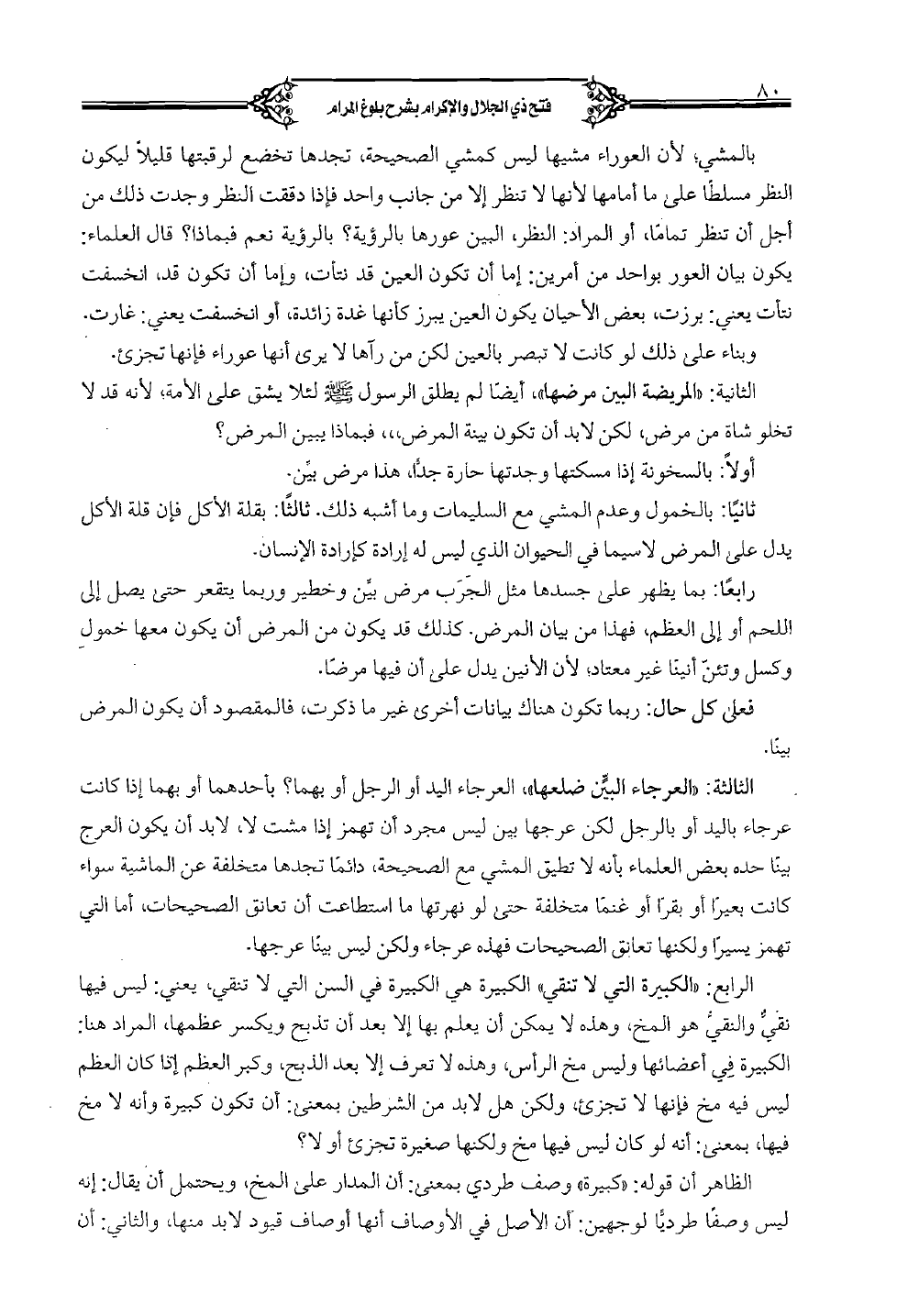 الثالثة: «العرجاء البين ضلعها» العرجاء اليد أو الرجل أو بهما؟ بأحدهما أو بهما إذا كانت عرجاء باليد أو بالرجل لكن عرجها بين ليس مجرد أن تهمز إذا مشت لا، لابد أن يكون العرج بينا حده بعض العلماء بأنه لا تطيق المشي مع الصحيحة، دائماً تجدها متخلفة عن الماشية سواء كانت بعيراً أو بقراً أو غنماً متخلفة حتى لو نهرتها ما استطاعت أن تعانق الصحيحات، أما التي تهمز يسيراً ولكنها تعانق الصحيحات فهذه عرجاء ولكن ليس بينا عرجها.