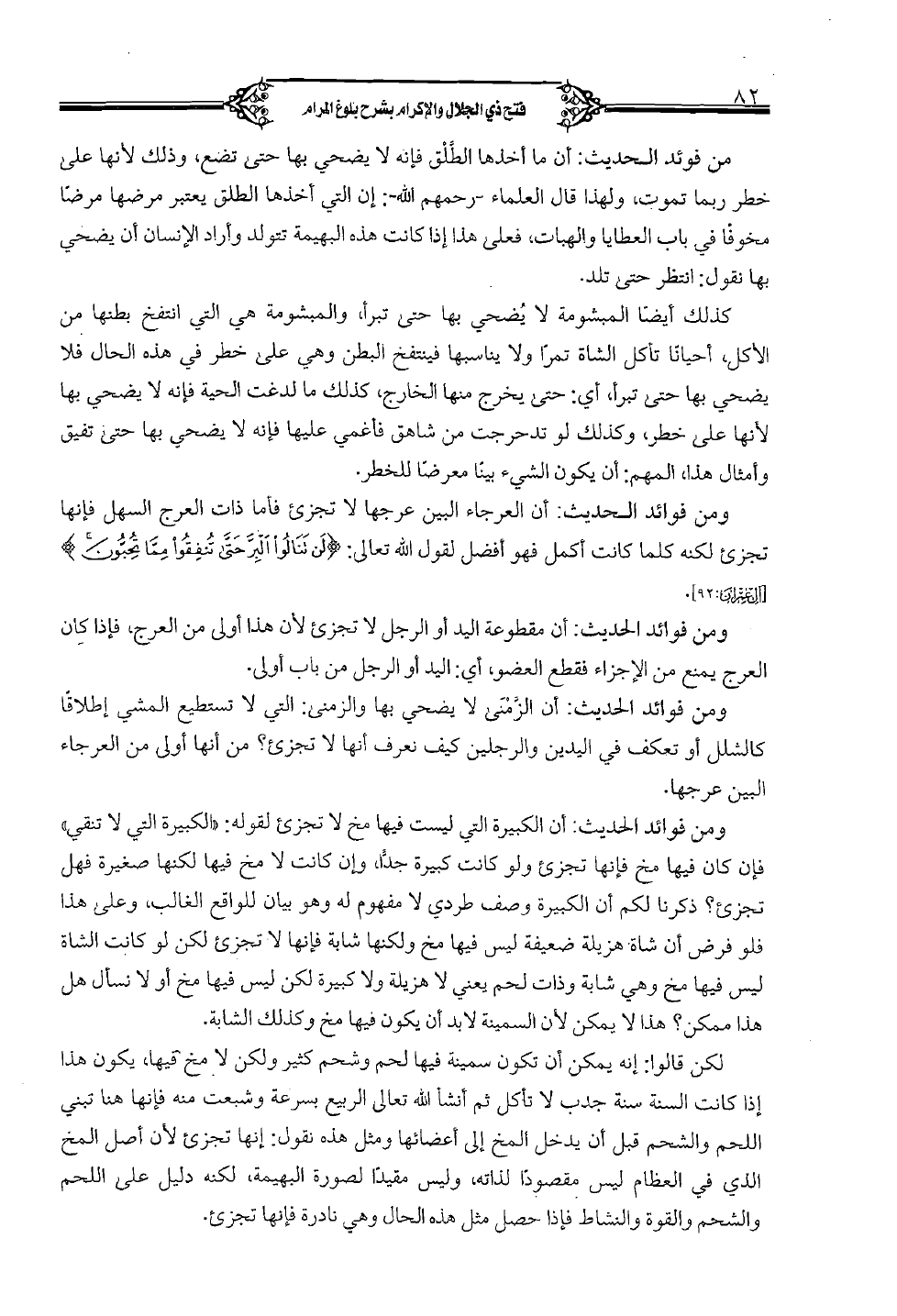 ومن فوائد الحديث: أن الكبيرة التي ليست فيها مخ لا تجزئ لقوله: «الكبيرة التي لا تنقي» فإن كان فيها مخ فإنها تجزئ ولو كانت كبيرة جداً، وإن كانت لا مخ فيها لكنها صغيرة فهل تجزئ؟ ذكرنا لكم أن الكبيرة وصف طردي لا مفهوم له وهو بيان للواقع الغالب، وعلى هذا فلو فرض أن شاة هزيلة ضعيفة ليس فيها مخ ولكنها شابة فإنها لا تجزئ لكن لو كانت الشاة ليس فيها مخ وهي شابة وذات لحم يعني لا هزيلة ولا كبيرة لكن ليس فيها مخ أو لا نسأل هل هذا ممكن؟ هذا لا يمكن لأن السمينة لابد أن يكون فيها مخ وكذلك الشابة.