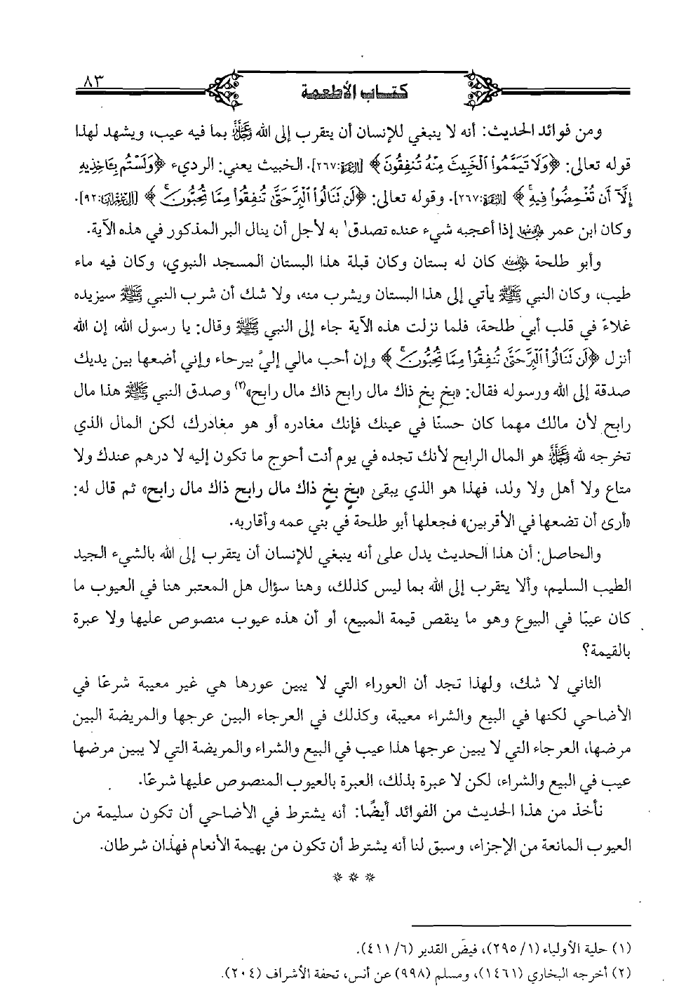 والحاصل: أن هذا الحديث يدل على أنه ينبغي للإنسان أن يتقرب إلى الله بالشيء الجيد الطيب السليم، وألا يتقرب إلى الله بما ليس كذلك، وهنا سؤال هل المعتبر هنا في العيوب ما كان عيباً في البيوع وهو ما ينقص قيمة المبيع، أو أن هذه عيوب منصوص عليها ولا عبرة بالقيمة.