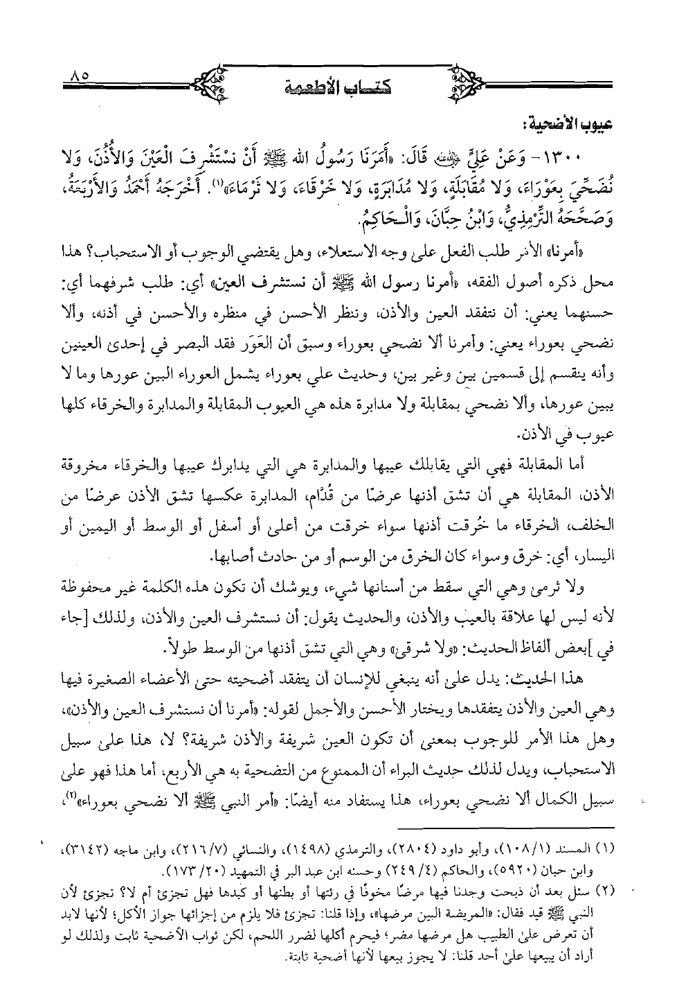 1300 - وعن علي رضي الله عنه: قال «أمرنا رسول الله صلى الله عليه وسلم أن نستشرف العين والأذن ولا نضحي بعوراء، ولا مقابلة ولا مدابرة، ولا خرقاء ولا ثرماء» أخرجه أحمد والأربعة وصححه الترمذي وابن حبان والحاكم.