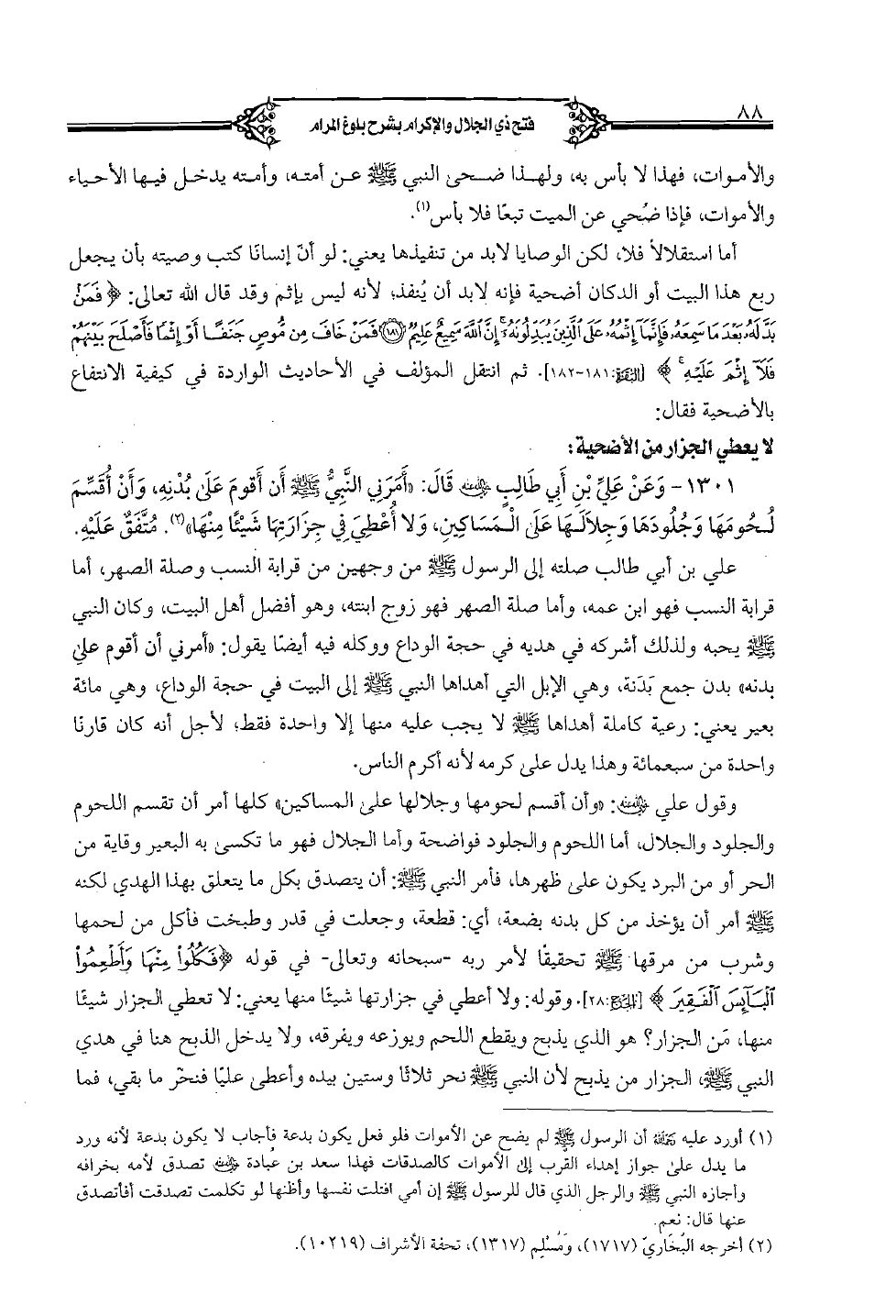 1301 - وعن علي بن أبي طالب رضي الله عنه قال: «أمرني النبي صلى الله عليه وسلم أن أقوم على بدنه، وأن أقسم لحومها وجلودها وجلالها على المساكين، ولا أعطي في جزارتها شيئاً منها» متفق عليه.