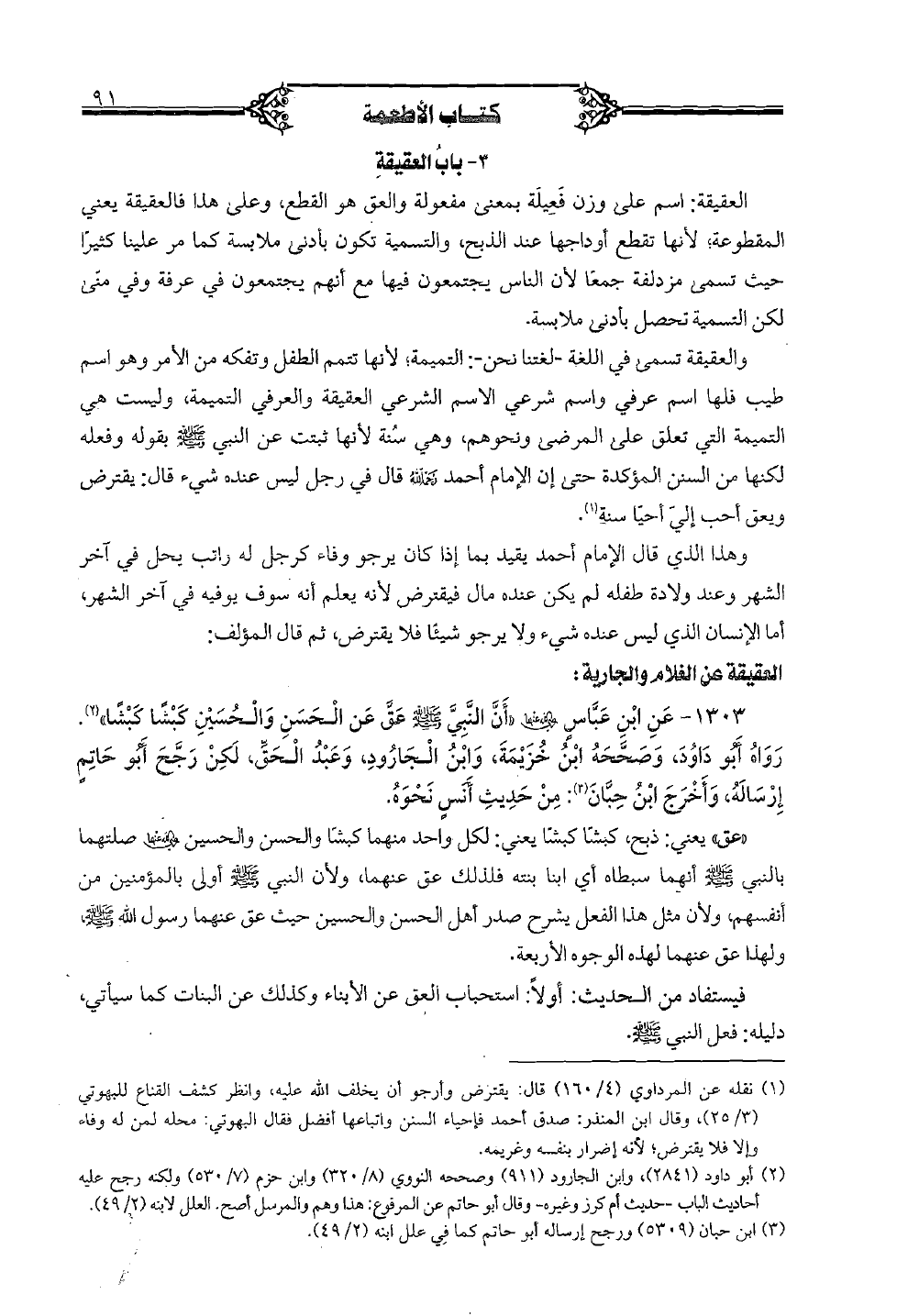 العقيقة: اسم على وزن فعلية بمعنى مفعولة والعق هو القطع، وعلى هذا فالعقيقة يعني المقطوعة؛ لأنها تقطع أوداجها عند الذبح، والتسمية تكون بأدنى ملابسة كما مر علينا كثيرا حيث تسمى مزدلقة جمعا لأن الناس يجتمعون فيها مع أنهم يجتمعون في عرفة وفي منى لكن التسمية تحصل بأدنى ملابسة.