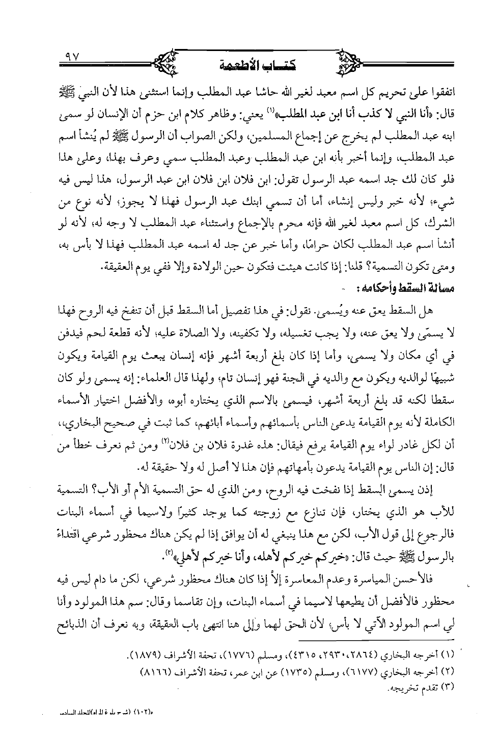 اتفقوا على تحريم كل اسم معبد لغير الله حاشا عبد المطلب وإنما استثنى هذا لأن النبي صلى الله عليه وسلم قال: «أنا النبي لا كذب أنا ابن عبد المطلب» يعني: وظاهر كلام ابن حزم أن الإنسان لو سمى ابنه عبد المطلب لم يخرج عن إجماع المسلمين، ولكن الصواب أن الرسول صلى الله عليه وسلم لم ينشا اسم عبد المطلب، وإنما أخبر بأنه ابن عبد المطلب وعبد المطلب سمي وعرف بهذا، وعلى هذا فلو كان لك جد اسمه عبد الرسول تقول: ابن فلان ابن فلان ابن عبد الرسول، هذا ليس فيه شيء لأنه خبر وليس إنشاء، أما أن تسمي ابنك عبد الرسول فهذا لا يجوز، لأنه نوع من الشرك، كل اسم معبد لغير الله فإنه محرم بالإجماع واستثناء عبد المطلب لا وجه له؛ لأنه لو أنشا اسم عبد المطلب لكان حراما، وأما خبر عن جد له اسمه عبد المطلب فهذا لا بأس به، ومتى تكون التسمية؟ قلنا: إذا كانت هيئت فتكون حين الولادة وإلا ففي يوم العقيقة.