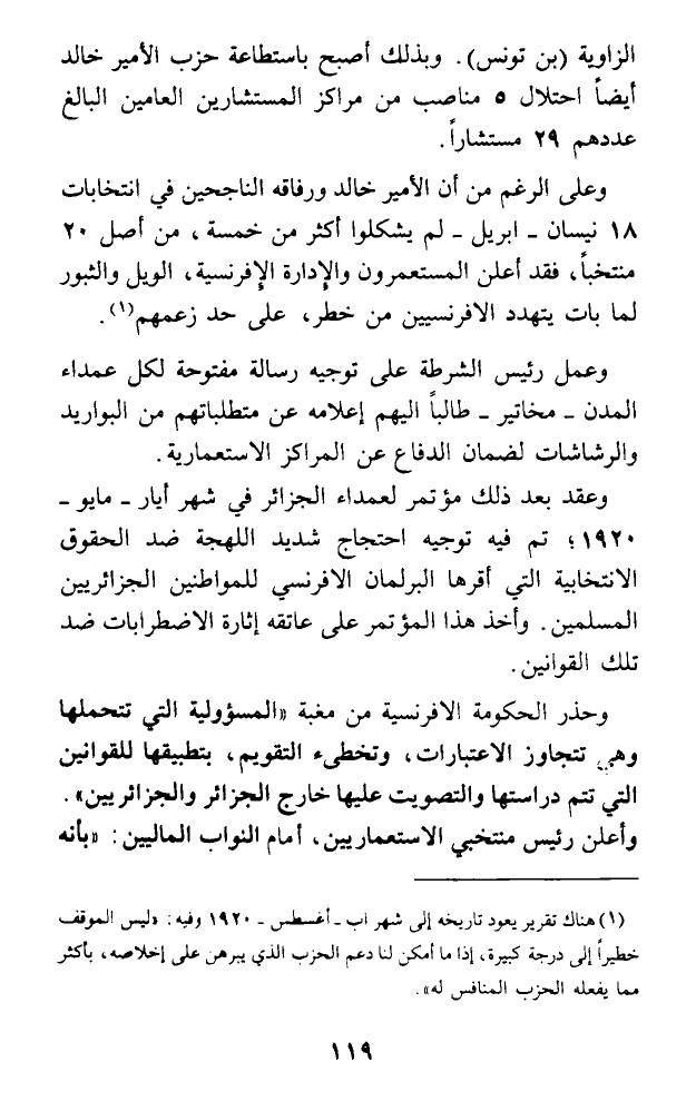 وعلى الرغم من أن الأمير خالد ورفاقه الناجحين في انتخابات 18 نيسان - أبريل - لم يشكلوا أكثر من خمسة، من أصل 20 منتخبا، فقد أعلن المستعمرون والإدارة الإفرنسية، الويل والثبور لما بات يتهدد الإفرنسيين من خطر، على حد زعمهم (¬1).