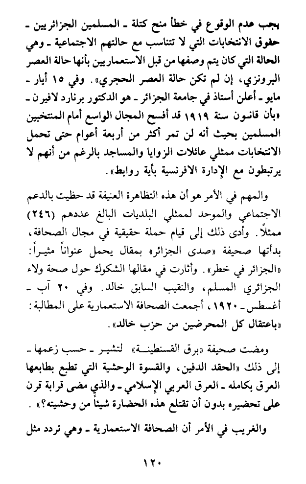 يجب عدم الوقوع في خطأ منح كتلة - المسلمين الجزائريين - حقوق الانتخابات التي لا تتناسب مع حالتهم الاجتماعية - وهي الحالة التي كان يتم وصفها من قبل الاستعماريين بأنها حالة العصر البرونزي، إن لم تكن حالة العصر الحجري). وفي 15 أيار - مايو - أعلن أستاذ في جامعة الجزائر - هو الدكتور برنارد لافيرن - (بأن قانون سنة 1919 قد أفسح المجال الواسع أمام المنتخبين المسلمين بحيث أنه لن تمر أكثر من أربعة أعوام حتى تحمل الانتخابات ممثلي عائلات الزوايا والمساجد بالرغم من أنهم لا يرتبطون مع الإدارة الإفرنسية بأية روابط).