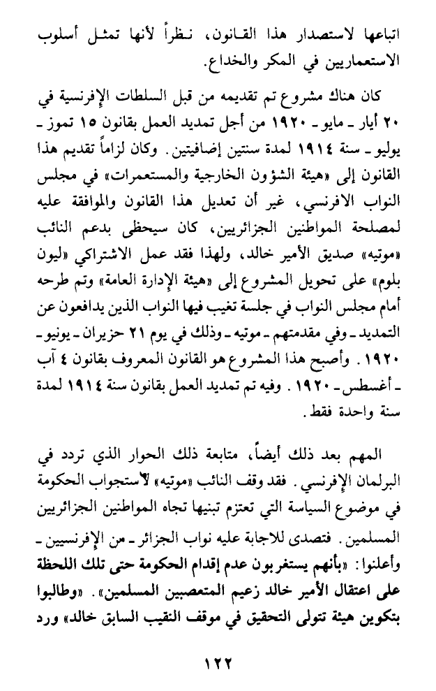 كان هناك مشروع تم تقديمه من قبل السلطات الإفرنسية في 20 أيار - مايو - 1920 من أجل تمديد العمل بقانون 15 تموز - يوليو - سنة 1914 لمدة سنتين إضافيتين. وكان لزاما تقديم هذا القانون إلى (هيئة الشؤون الخارجية والمستعمرات) في مجلس النواب الإفرنسي، غير أن تعديل هذا القانون والموافقة عليه لمصلحة المواطنين الجزائريين، كان سيحظى بدعم النائب (موتيه) صديق الأمير خالد، ولهذا فقد عمل الاشتراكي (ليون بلوم) على تحويل المشروع إلى (هيئة الإدارة العامة) وتم طرحه