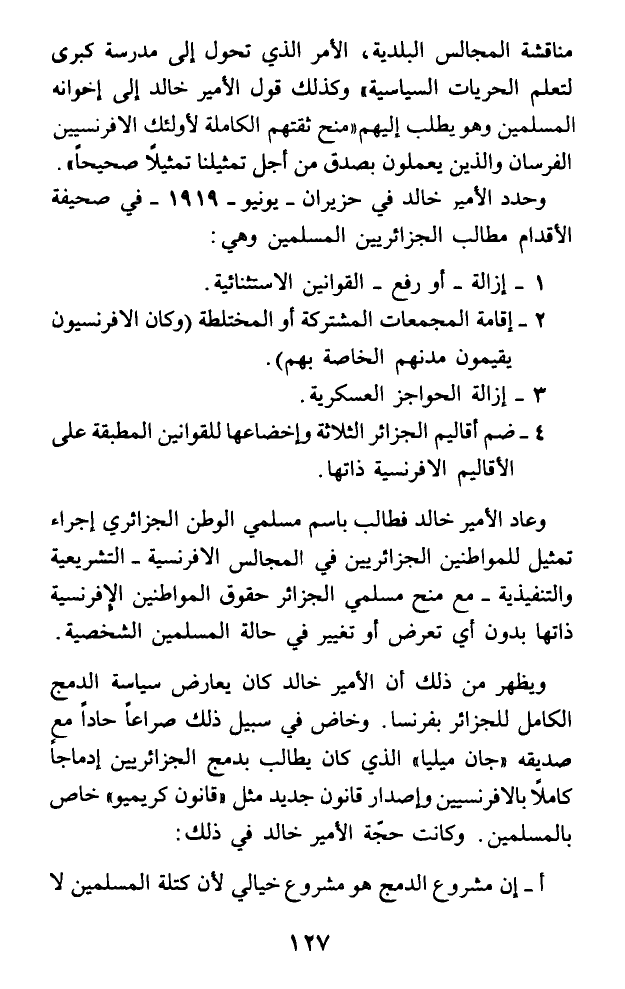 مناقشة المجالس البلدية، الأمر الذي تحول إلى مدرسة كبرى لتعلم الحريات السياسية) وكذلك قول الأمير خالد إلى إخوانه المسلمين وهو يطلب إليهم (منح ثقتهم الكاملة لأولئك الإفرنسيين الفرسان والذين يعملون بصدق من أجل تمثيلنا بمثيلا صحيحا).