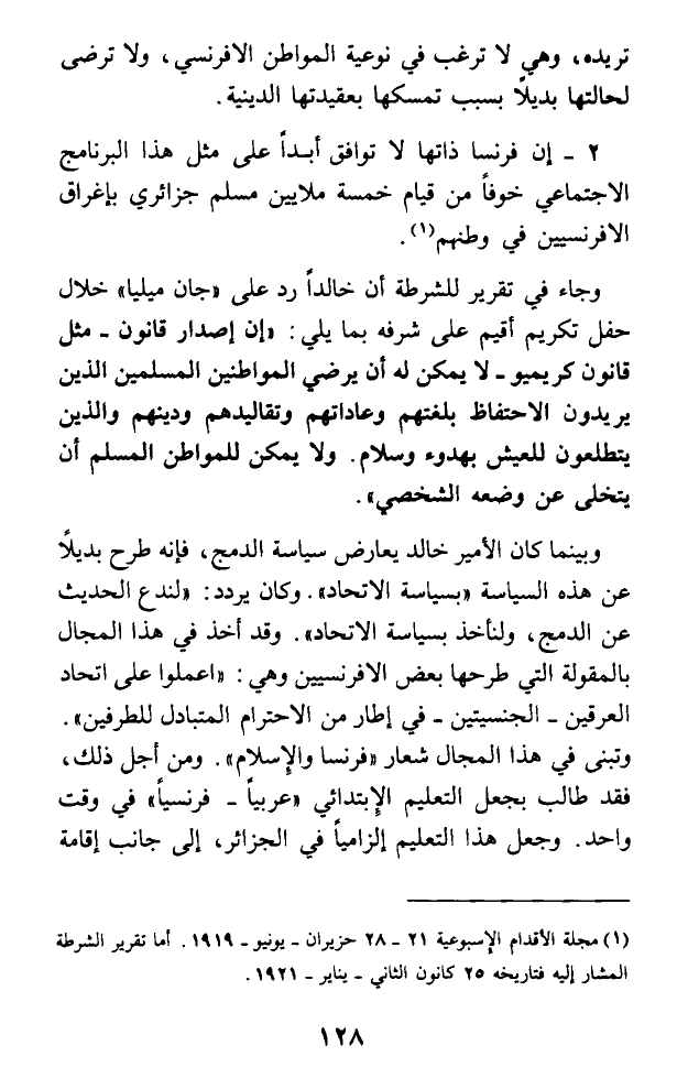 2 - إن فرنسا ذاتها لا توافق أبدا على مثل هذا البرنامج الاجتماعي خوفا من قيام خمسة ملايين مسلم جزائري بإغراق الإفرنسيين في وطنهم (¬1).