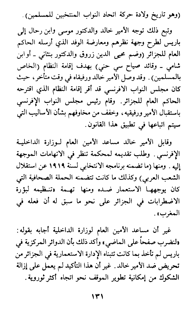 وقابل الأمير خالد مساعد الأمين العام لوزارة الداخلية الإفرنسي. وطلب تقديمه لمحكمة تنظر في الاتهامات الموجهة إليه. ومنها (ما تضمنه برنامجه الانتخابي لسنة 1919 عن استقلال الشعب العربي) وكذلك ما كانت تتضمنه الحملة الصحافية التي كان يوجهها الاستعمار ضده ومنها تهمة (تنظيمه لبؤرة الاضطرابات في الجزائر على نحو ما سبق له أن فعله في المغرب).