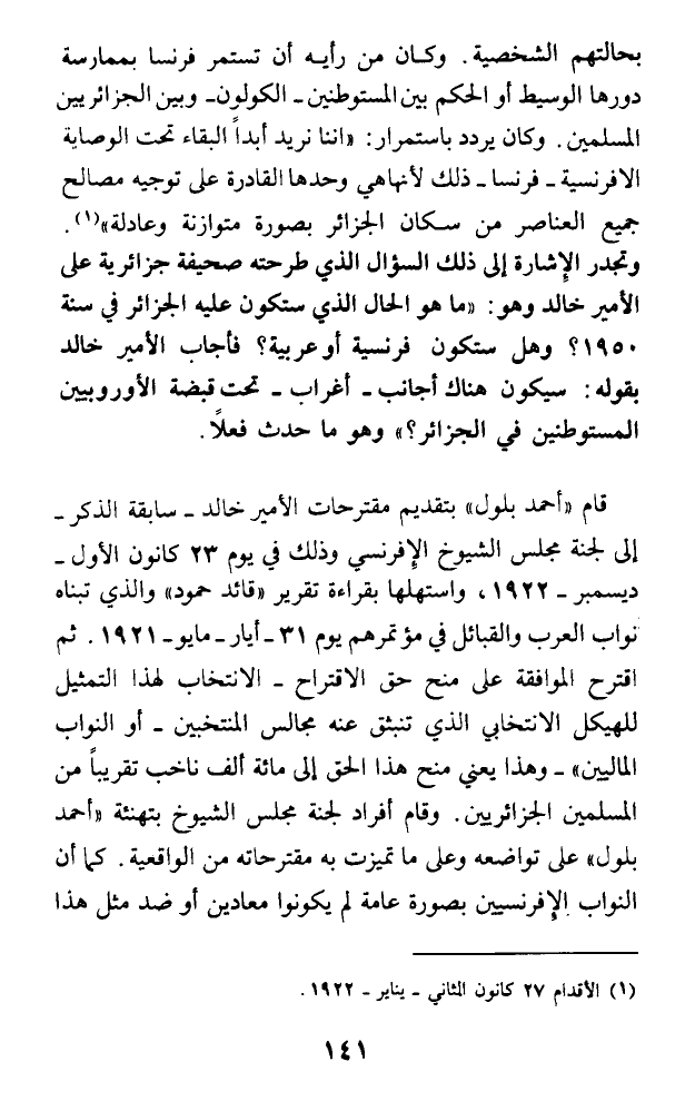 بحالتهم الشخصية. وكان من رأيه أن تستمر فرنسا بممارسة دورها الوسيط أو الحكم بين المستوطنين - الكولون - وبين الجزائريين المسلمين. وكان يردد باستمرار: (أننا نريد أبدا البقاء تحت الوصاية الإفرنسية - فرنسا - ذلك لأنها هي وحدها القادرة على توجيه مصالح جميع العناصر من سكان الجزائر بصورة متوازنة وعادلة) (¬1). وتجدر الإشارة إلى ذلك السؤال الذي طرحته صحيفة جزائرية على الأمير خالد وهو: (ما هو الحال الذي ستكون عليه الجزائر في سنة 1950؟ وهل ستكون فرنسية أو عربية؟ فأجاب الأمير خالد بقوله: (سيكون هناك أجانب - أغراب - تحت قبضة الأوروبيين المسوطنين في الجزائر؟، وهو ما حدث فعلا.