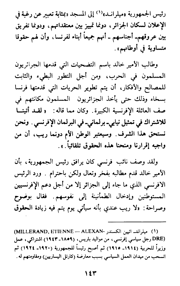 رئيس الجمهورية (ميلراند) (¬1) إلى المسجد (بمثابة تعبير عن رغبة في الإعلان لسكان الجزائر، دونما تمييز بين معتقداتهم، ودونما تفريق بين عروقهم - أجناسهم - أنهم جميعا أبناء لفرنسا، وأن لهم حقوقا متساوية في أوطانهم).