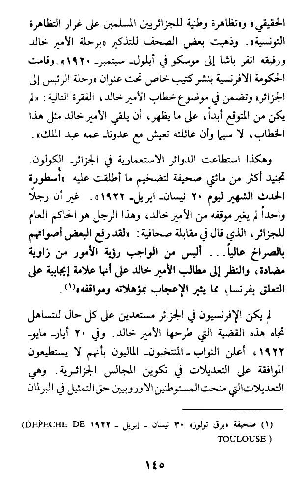 لم يكن الإفرنسيون في الجزائر مستعدين على كل حال للتساهل تجاه هذه القضية التي طرحها الأمير خالد. وفي 20 أيار - مايو - 1922، أعلن النواب - المنتخبون - الماليون بأنهم لا يستطيعون الموافقة على التعديلات في تكوين المجالس الجزائرية. وهي التعديلات التي منحت، المستوطنين الأوروبيين حتى التمثيل في البرلمان