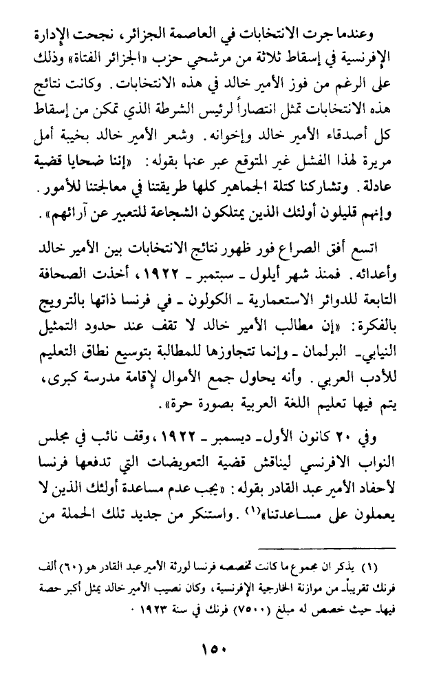 (¬1) يذكر أن مجموع ما كانت تخصصه فرنسا لورثة الأمير عبد القادر هو (60) ألف فرنك تقريبا - من موازنة الخارجية الإفرنسية، وكان نصيب الأمير خالد يمثل أكبر حصة فيها - حيث خصص له مبلغ (7500) فرنك في سنة 1923.