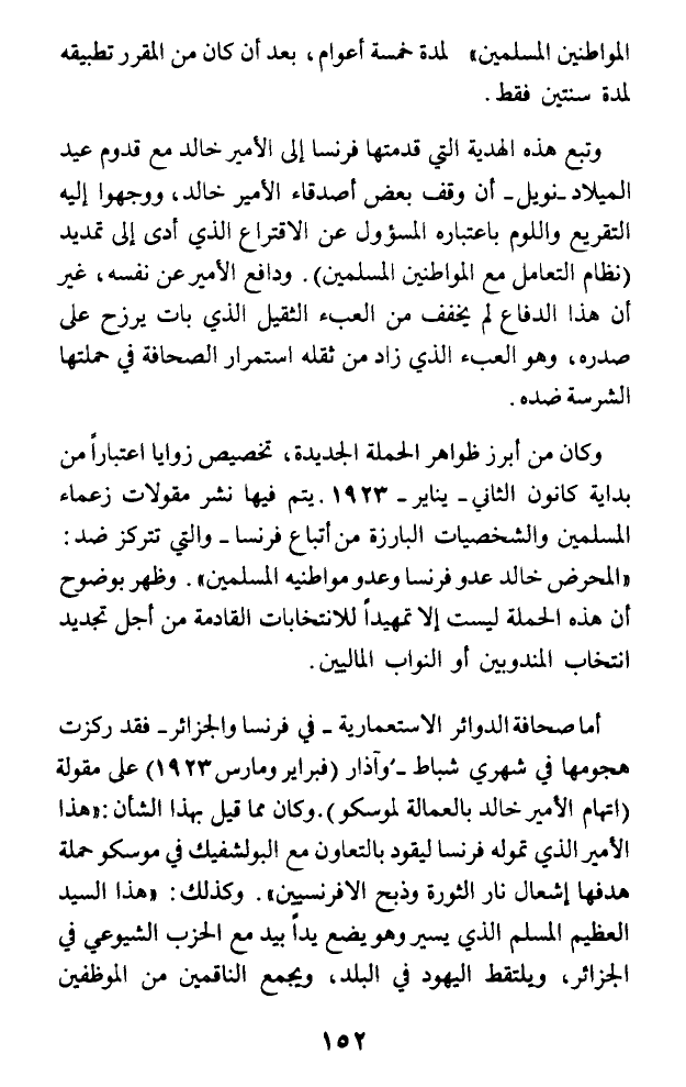 أما صحافة الدوائر الاستعمارية - في فرنسا والجزائر - فقد ركزت هجومها في شهري شباط - وآذار (فبراير ومارس 1933) على مقولة (اتهام الأمير خالد بالعمالة لموسكو). وكان مما قيل بهذا الشأن: (هذا الأمير الذي تموله فرنسا ليقود بالتعاون مع البولشفيك في موسكو حملة هدفها إشعال نار الثورة وذبح الإفرنسيين). وكذلك: (هذا السيد العظيم المسلم الذي يسير وهو يضع يدا بيد مع الحزب الشيوعي في الجزائر، ويلتقط اليهود في البلد، ويجمع الناقمين من الموظفين