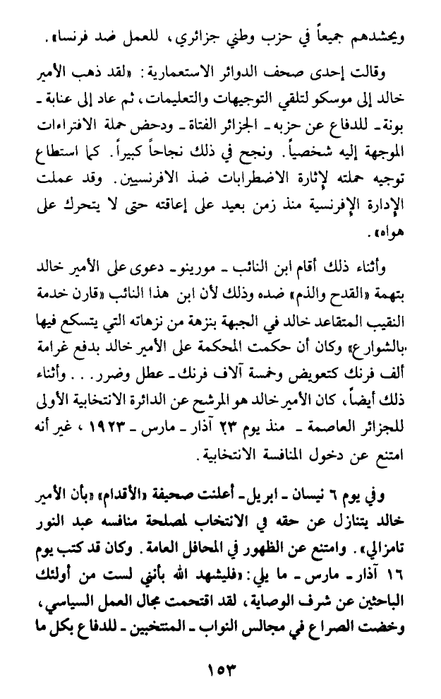 وأثناء ذلك أقام ابن النائب - مورينو - دعوى على الأمير خالد بتهمة (القدح والذم) ضده وذلك لأن ابن هذا النائب (قارن خدمة النقيب المتقاعد خالد في الجبهة بنزهة من نزهاته التي يتسكع فيها (بالشوارع) وكان أن حكمت المحكمة على الأمير خالد بدفع غرامة ألف فرنك كتعويض وخمسة آلاف فرنك - عطل وضرر ... وأثناء ذلك أيضا، كان الأمير خالد هو المرشح عن الدائرة الانتخابية الأولى للجزائر العاصمة - منذ يوم 23 آذار - مارس - 1923، غير أنه امتنع عن دخول المنافسة الانتخابية.