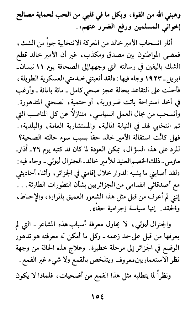 أثار انسحاب الأمير خالد من المعركة الانتخابية جوا من الشك، فمضى المواطنون بين مصدق ومكذب، غير أن الأمير خالد قطع الشك باليقين في رسالته التي وجهها إلى الصحافة يوم 11 نيسان - أبريل - 1923 وجاء فيها: (لقد أتعبتني خدمتي العسكرية الطويلة، فأحلت على التقاعد بحالة عجز صحي كامل - مائة بالمائة - وأرغب في أخذ استراحة باتت ضرورية، أو حتمية، لصحتي المتدهورة. وانسحب من مجال العمل السياسي، متنازلا عن كل المناصب التي تم انتخابي لها - في النيابة المالية، والمستشارية العامة، والبلدية). فهل كانت استقالة الأمير خالد حقا بسبب سوء حالته الصحية؟ للرد على هذا السؤال، يمكن العودة لما كان قد كتبه يوم 26 - آذار - مارس - ذلك الخصم العنيد للأمير خالد - الجنرال ليوتي - وجاء فيه: (لقد أصابني ما يشبه الدوار خلال إقامتي في الجزائر، وأثناء أحاديثي مع أصدقائي القدامى من الجزائريين بشأن التطورات الطارئة ... إنني لم أعرف من قبل مثل هذا الشعور العميق بالمرارة، والإحباط، والحقد. إنها سياسة إجرامية حقا).