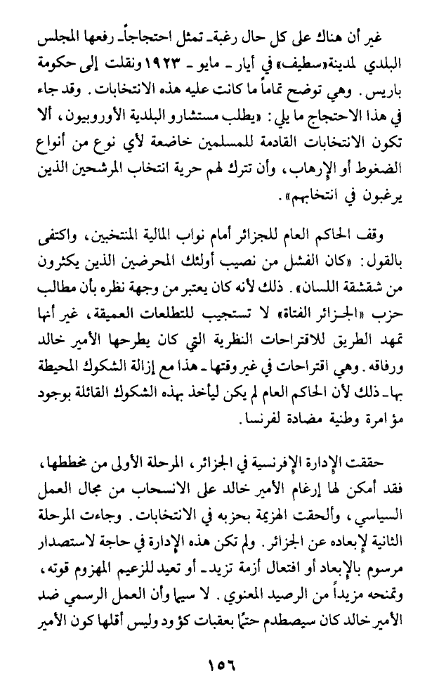 غير أن هناك على كل حال رغبة - تمثل احتجاجا - رفعها المجلس البلدي لمدينة (سطيف) في أيار - مايو - 1923 ونقلت إلى حكومة باريس. وهي توضح تماما ما كانت عليه هذه الانتخابات. وقد جاء في هذا الاحتجاج ما يلي: (يطلب مستشارو البلدية الأوروبيون، ألا تكون الانتخابات القادمة للمسلمين خاضعة لأي نوع من أنواع الضغوط أو الإرهاب، وأن تترك لهم حرية انتخاب المرشحين الذين يرغبون في انتخابهم).