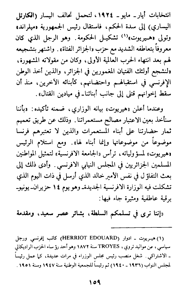 انتخابات أيار - مايو - 1924، لتحمل تحالف اليسار (الكارتل اليساري) إلى سدة الحكم، فاستقال رئيس الجمهورية (ميلراند) وتولى (هيريوت) (¬1) تشكيل الحكومة. وهو الرجل الذي كان معروفا بتعاطفه الشديد مع حزب (الجزائر الفتاة). واشتهر بتشجيعه لهم بعد انتهاء الحرب العالمية الأولى، وكان من مقولاته المشهورة، (لنشجع أولئك الفتيان المغمورين في الجزائر، والذين أخد الوطن الإفرنسي في استقبالهم واحتضانهم، كأبنائه الآخرين، منذ أن سقط إخوانهم قتلى إلى جانب أبنائنا - في ميادين القتال).