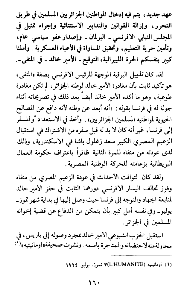 عهد جديد، يتم فيه إدخال المواطنين الجزائريين المسلمين في طريق التحرر، وإزالة القوانين والتدابير الاستثنائية وإجراء تمثيل في المجلس النيابي الإفرنسي - البرلمان - وإصدار عفو سياسي عام، وتأمين حرية التعليم، وتحقيق المساواة في الأعباء العسكرية. وأملنا كبير بنفسكم الحرة الليبرالية) التوقيع - الأمير خالد - في المنفى-.