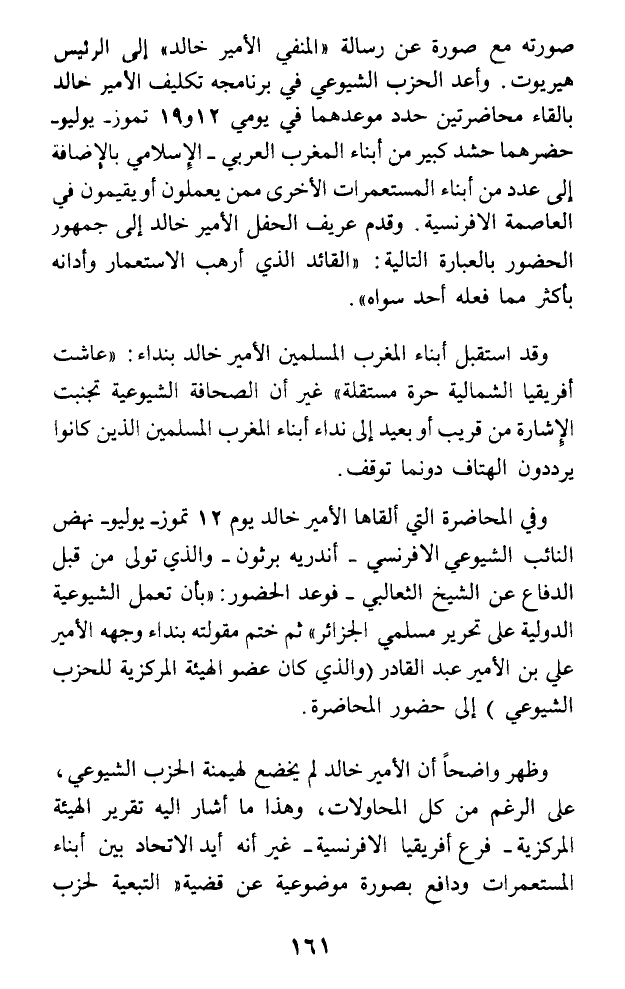 صورته مع صورة عن رسالة (المنفي الأمير خالد) إلى الرئيس هيريوت. وأعد الحزب الشيوعي في برنامجه تكليف الأمير خالد بإلقاء محاضرتين حدد موعدهما في يومي 12 و19 تموز - يوليو - حضرهما حشد كبير من أبناء المغرب العربي - الإسلامي بالإضافة إلى عدد من أبناء المستعمرات الأخرى ممن يعملون أو يقيمون في العاصمة الإفرنسية. وقدم عريف الحفل الأمير خالد إلى جمهور الحضور بالعبارة التالية: (القائد الذي أرهب الاستعمار وأدانه بأكثر مما فعله أحد سواه).