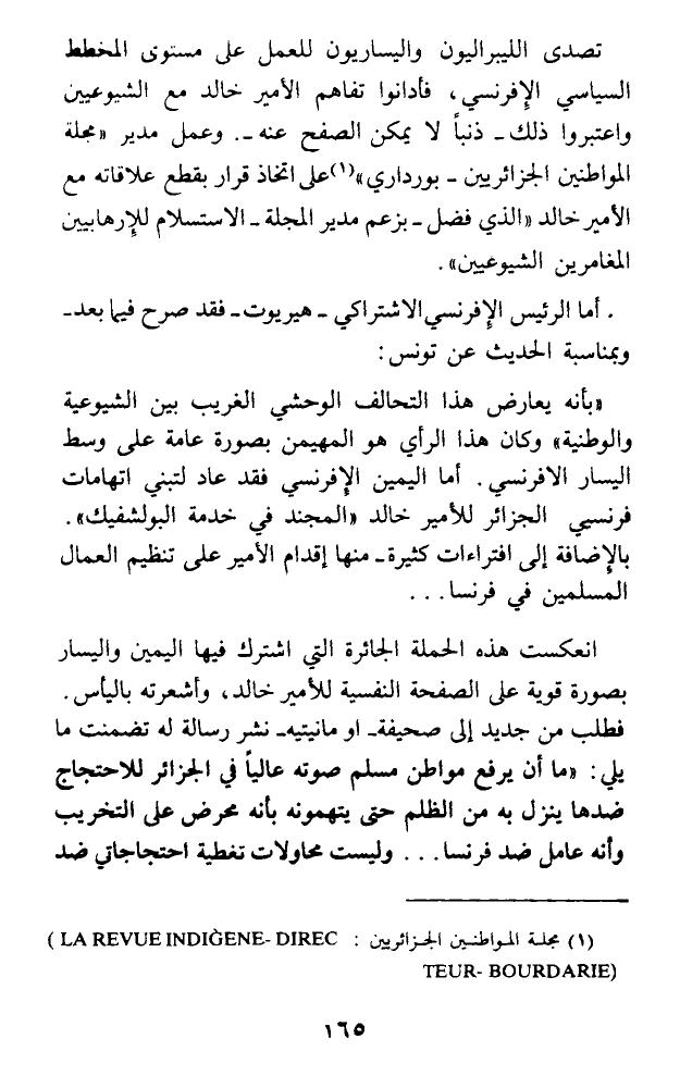 تصدى الليبراليون واليساريون للعمل على مستوى المخطط السياسي الإفرنسي، فأدانوا تفاهم الأمير خالد مع الشيوعيين واعتبروا ذلك - ذنبا لا يمكن الصفح عنه-. وعمل مدير (مجلة المواطنين الجزائريين - بورداري) (¬1) على اتخاذ قرار بقطع علاقاته مع الأمير خالد (الذي فضل - بزعم مدير المجلة - الاستسلام للإرهابيين المغامرين الشيوعيين).