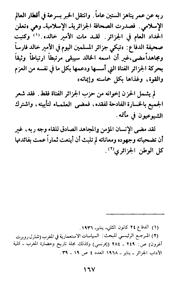 ربه عن عمر يناهز الستين عاما. وانتقل الخبر بسرعة في أقطار العالم الإسلامي. فصدرت الصحافة الجزائرية - الإسلامية - وهي (تعلن الحداد العام في الجزائر. لقد مات الأمير خالد). (¬1) وكتبت صحيفة الدفاع: (تبكي جزائر المسلمين اليوم في الأمير خالد فارسا ومجاهدا مضى، غير أن اسمه الخالد سيبقى مرتبطا ارتباطا وثيقا بحركة الجزائر الفتاة التي أسسها ودعمها بكل ما في نفسه من العزم والقوة، وغذاها بكل حماسته وإيمانه).