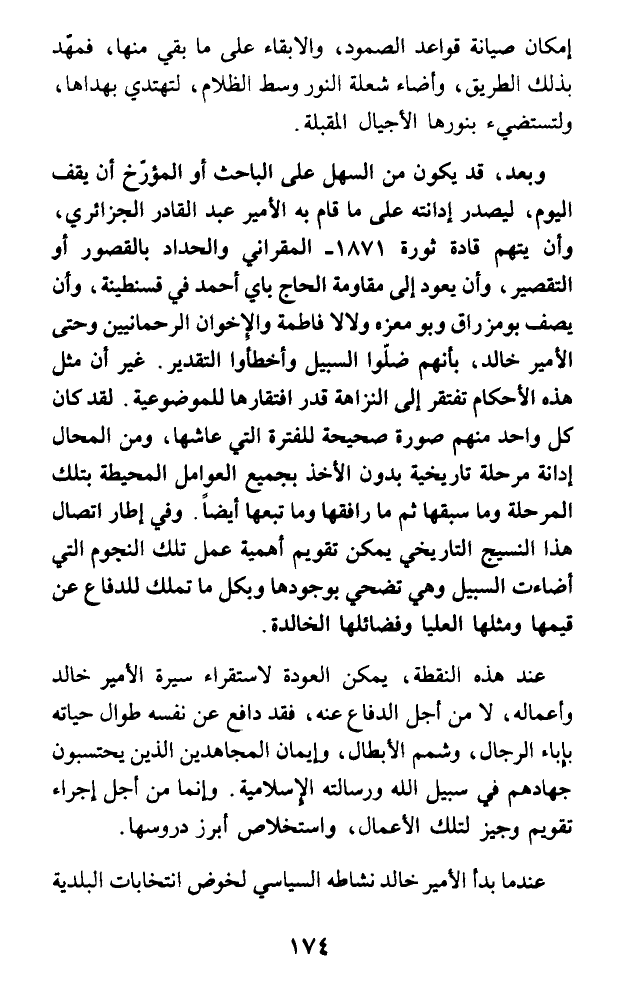 وبعد، قد يكون من السهل على الباحث أو المؤرخ أن يقف اليوم، ليصدر إدانته على ما قام به الأمير عبد القادر الجزائري، وأن يتهم قادة ثورة 1871 - المقراني والحداد بالقصور أو التقصير، وأن يعود إلى مقاومة الحاج باي أحمد في قسنطينة، وأن يصف بومزراق وبو معزه ولالا فاطمة والإخوان الرحمانيين وحتى الأمير خالد، بأنهم ضلوا السبيل وأخطأوا التقدير. غير أن مثل هذه الأحكام تفتقر إلى النزاهة قدر افتقارها للموضوعية. لقد كان كل واحد منهم صورة صحيحة للفترة التي عاشها، ومن المحال إدانة مرحلة تاريخية بدون الأخذ بجميع العوامل المحيطة بتلك المرحلة وما سبقها ثم ما رافقها وما تبعها أيضا. وفي إطار اتصال هذا النسيج التاريخي يمكن تقويم أهمية عمل تلك النجوم التي أضاءت السبيل وهي تضحي بوجودها وبكل ما تملك للدفاع عن قيمها ومثلها العليا وفضائلها الخالدة.