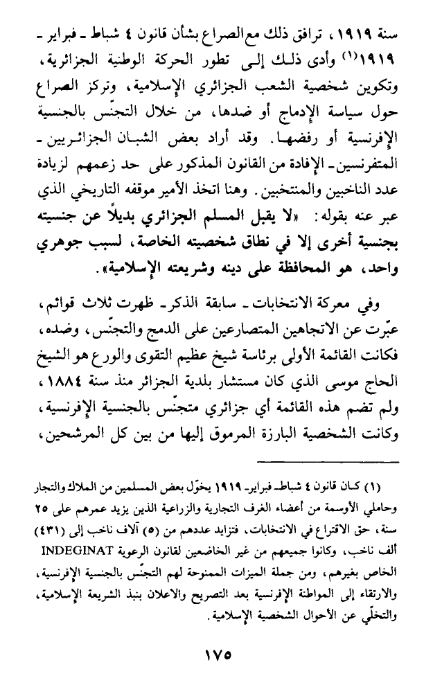 (¬1) كان قانون 4 شباط - فبراير - 1919 يخول بعض المسلمين من الملاك والتجار وحاملي الأوسمة من أعضاء الغرف التجارية والزراعية الذين يزيد عمرهم على 25 سنة، حتى الاقتراع في الانتخابات، فتزايد عددهم من (5) آلاف ناخب إلى (431) ألف ناخب، وكانوا جميعهم من غير الخاضعين لقانون الرعوية INDIGENAT الخاص بغيرهم، ومن جملة الميزات الممنوحة لهم التجنس بالجنسية الإفرنسية، والارتقاء إلى المواطنة الإفرنسية بعد التصريح والإعلان بنبذ الشريعة الإسلامية، والتخلي عن الأحوال الشخصية الإسلامية.
