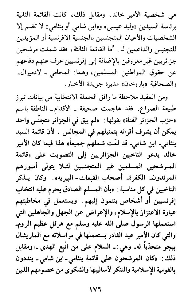 هي شخصية الأمير خالد. ومقابل ذلك، كانت القائمة الثانية برئاسة السيدين (وليد عسيى) و (ابن شامي أو بنثامي) لا تضم إلا الشخصيات والأعيان المتجنسين بالجنسية الإفرنسية أو المؤيدين للتجنيس والداعمين له. أما القائمة الثالثة، فقد شملت مرشحين جزائريين غير معروفين بالإضافة إلى إفرنسيين عرف عنهم دفاعهم عن حقوق المواطنين المسلمين، وهما: المحامي - لادميرال -والصحافية (باروخان) مديرة جريدة الأخبار.