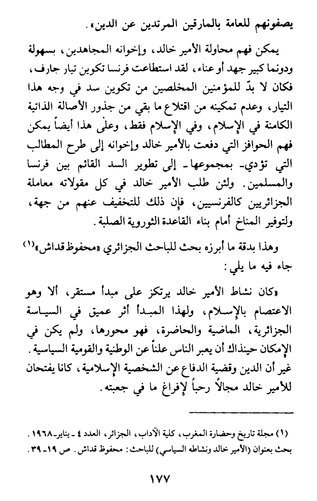 (¬1) مجلة تاريخ وحضارة المغرب، كلية الآداب، الجزائر، العدد 4 - يناير - 1968. بحث بعنوان (الأمير خالد ونشاطه السياسي) للباحث: محفوظ قداش. ص 19 - 39.