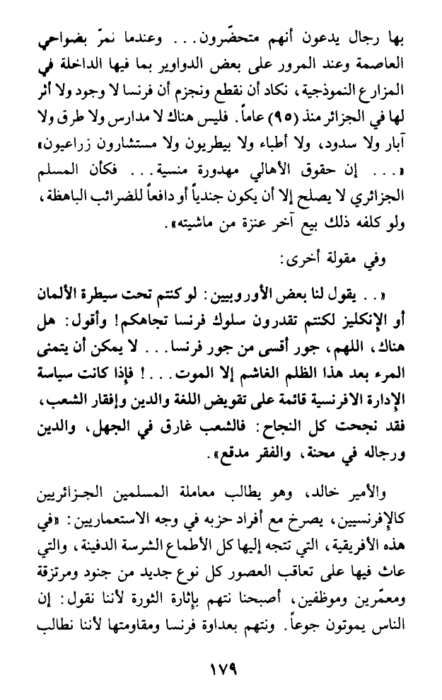 بها رجال يدعون أنهم متحضرون ... وعندما نمر بضواحي العاصمة وعند المرور على بعض الدواوير بما فيها الداخلة في المزارع النموذجية، نكاد أن نقطع ونجزم أن فرنسا لا وجود ولا أثر لها في الجزائر منذ (95) عاما. فليس هناك لا مدارس ولا طرق ولا آبار ولا سدود، ولا أطباء ولا بيطريون ولا مستشارون زراعيون) (... إن حقوق الأهالي مهدورة منسية ... فكأن المسلم الجزائري لا يصلح إلا أن يكون جنديا أو دافعا للضرائب الباهظة، ولو كلفه ذلك بيع آخر عنزة من ماشيته).