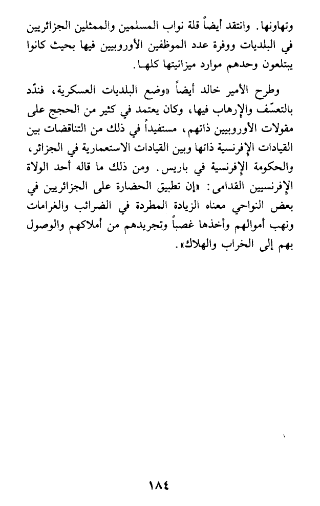 وتهاونها. وانتقد أيضا قلة نواب المسلمين والممثلين الجزائريين في البلديات ووفرة عدد الموظفين الأوروبيين فيها بحيث كانوا يبتلعون وحدهم موارد ميزانيتها كلها.